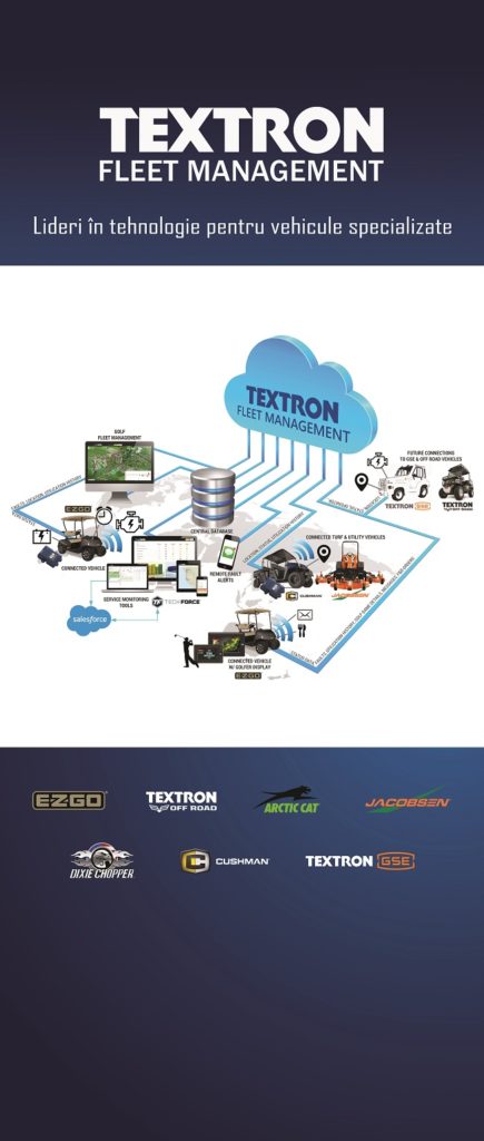 Vă reamintim că Divizia Textron Vehicule Specializate a deschis la Pitești o sucursală unică în cadrul Grupului, specializată în dezvoltare de software. Firma a creat deja peste 40 de locuri de muncă în high-tech și are de gând să crească acest număr. Textron Fleet Management este o corporație de top prezentă în peste 25 de state la nivel mondial. Textron Inc. este una dintre cele mai cunoscute companii multi-industrie din lume, o companie care își pune în valoare rețeaua globală de companii în aviație, apărare, industrial și finanțe, pentru a oferi clienților soluții și servicii inovatoare. Cu peste 35.000 de angajați, Textron operează în 25 de țări din întreaga lume și este cunoscută pentru mărcile sale puternice, cum ar fi: Greenlee, Bell Helicopter, Cessna, Beechraft și E-Z-GO.