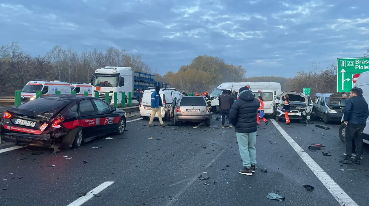 „În coliziune au fost implicate 12 autoturisme, 26 persoane au fost evaluate şi asistate medical la locul evenimentului, toate conştiente, o singură persoană fiind transportată la spital (bărbat, 44 ani, cu traumatism cranio-cerebral)”, informează Inspectoratul pentru Situaţii de Urgenţă Prahova.