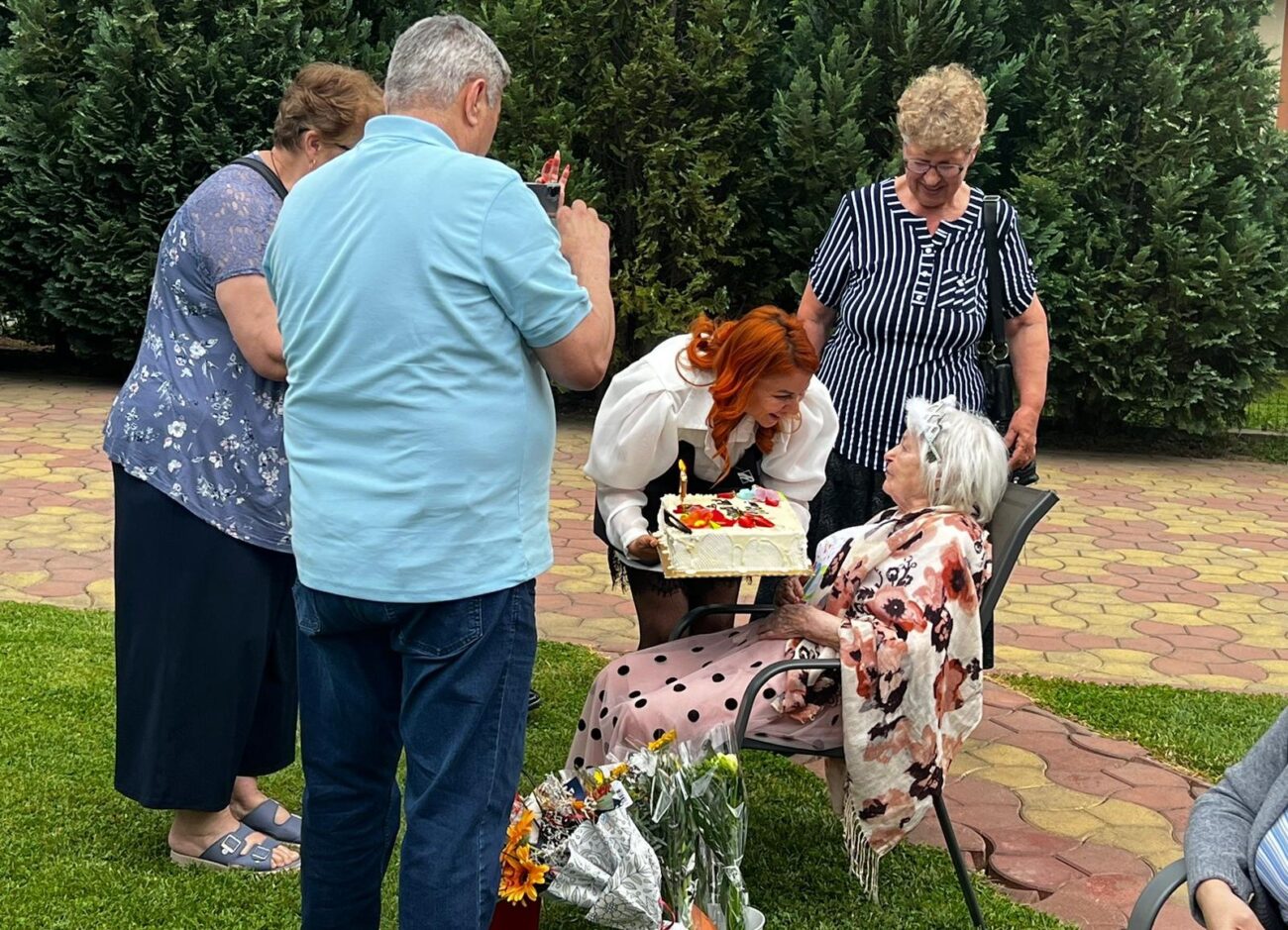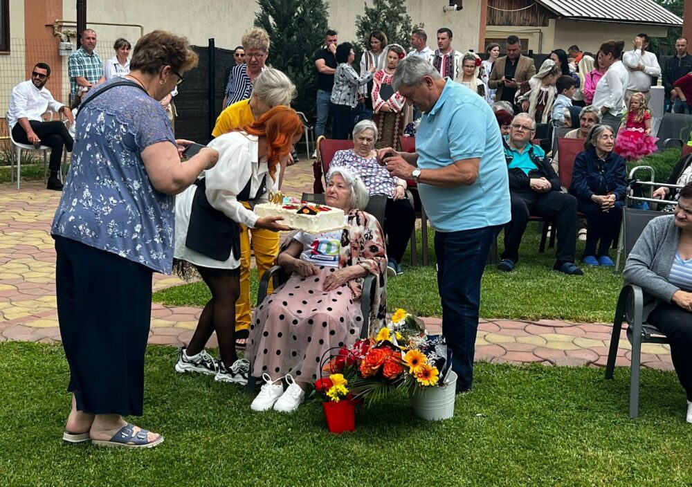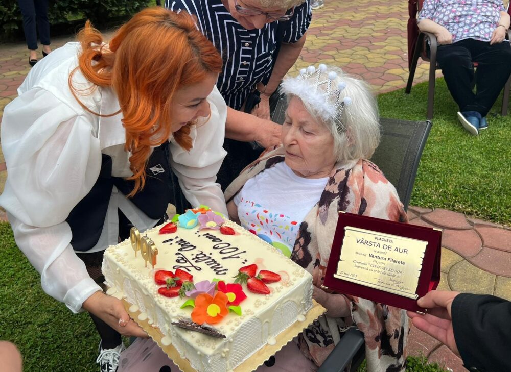 Pe langa un generos candy bar organizat pentru invitati la frumoasa petrecere, Filareta Ventura a fost sarbatorita asa cum se cuvine, cu un tort aniversar, la implinirea varstei de 100 de ani, dar si cu o placheta care sa evidentieze si sa marcheze implinirea acestei “varste de aur”. Raluca Georgescu, managerul unitatii si sufletul acestui lacas pentru batrani, i-a fost alaturi Filaretei Ventura in aceste momente pline de sensibilitate si incarcatura sufleteasca, intr-o zi istorica chiar si pentru Caminul de Batrani Confort Senior Leordeni, fiind prima data cand sarbatoresc un beneficiar la implinirea a 100 de ani de viata, aceasta varsta glorioasa fiind una greu de atins pentru romani.