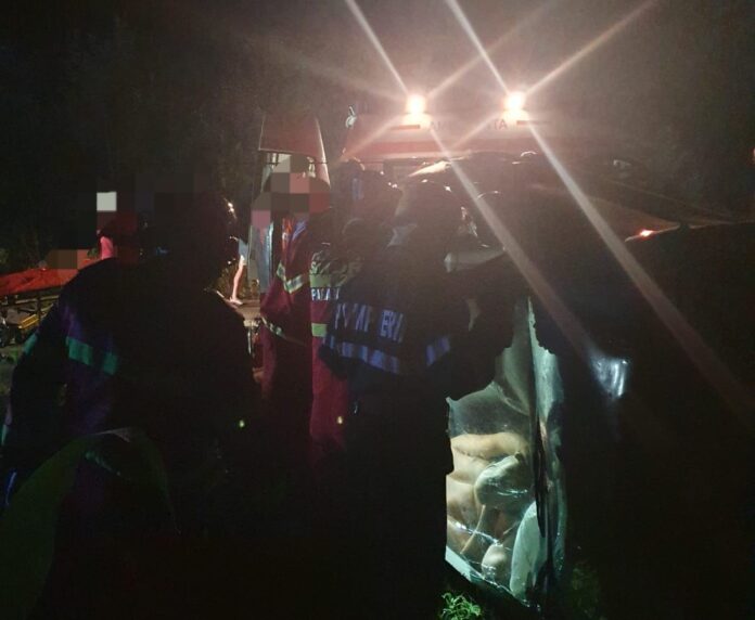A intrat cu masina intr-un stalp, apoi s-a rasturnat in afara drumului. Doua persoane au fost preluate de către echipajele medicale prezente la fața locului, una avand nevoie de efectuarea manevrelor de descarcerare, fiind blocată în interiorul autoturismului. S-a intamplat dupa miezul noptii trecute. Din informatiile primite la primele ore ale diminetii, soferul care a produs accidentul conducea fără drept și sub influența alcoolului. Acesta nu poseda permis de conducere.