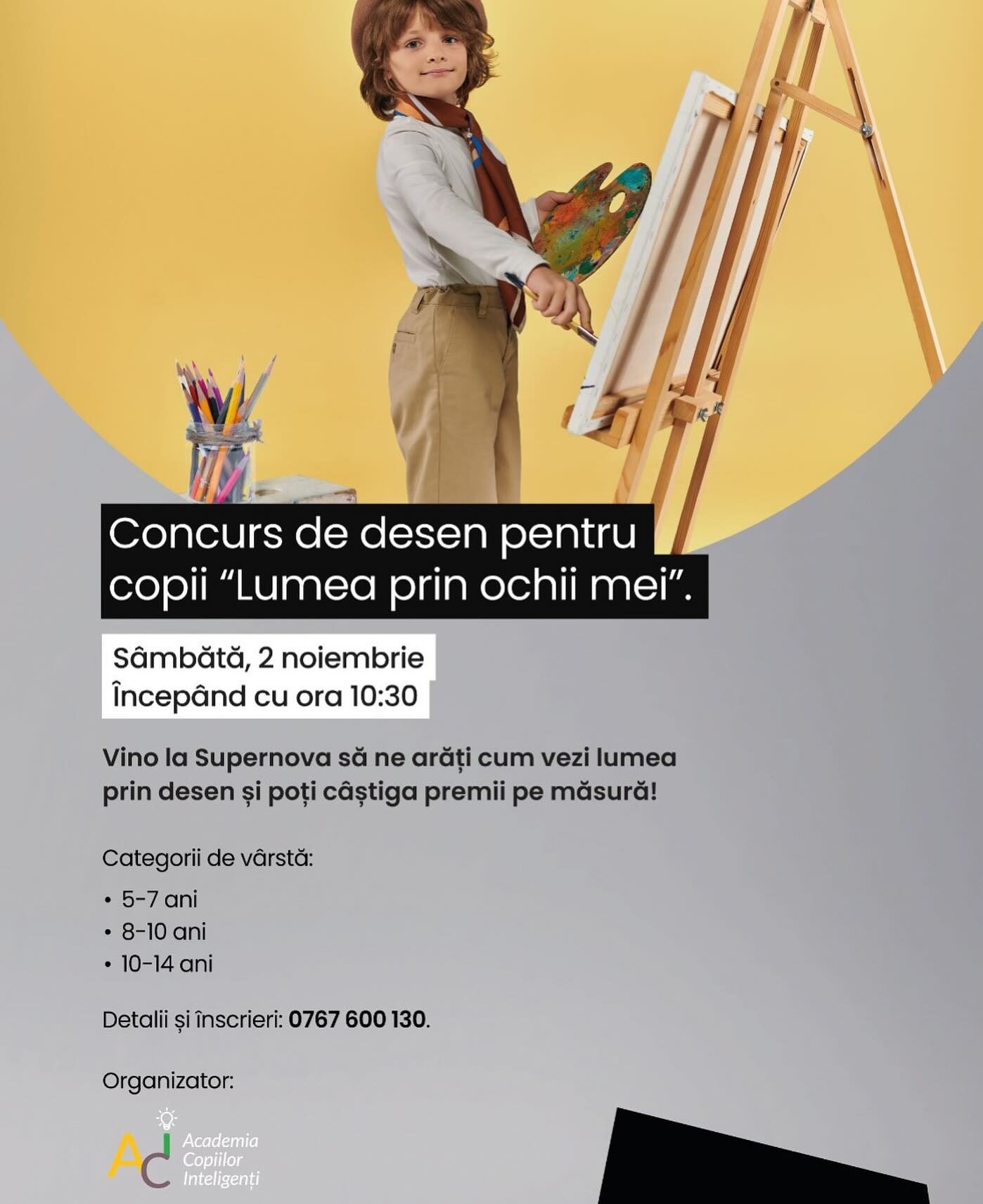 Premii speciale pentru cei mai talentați desenatori, sambata, 2 noiembrie, la Centrul Comercial SUPERNOVA Pitesti. Evenimentul este organizat de Academia Copiilor Inteligenti.