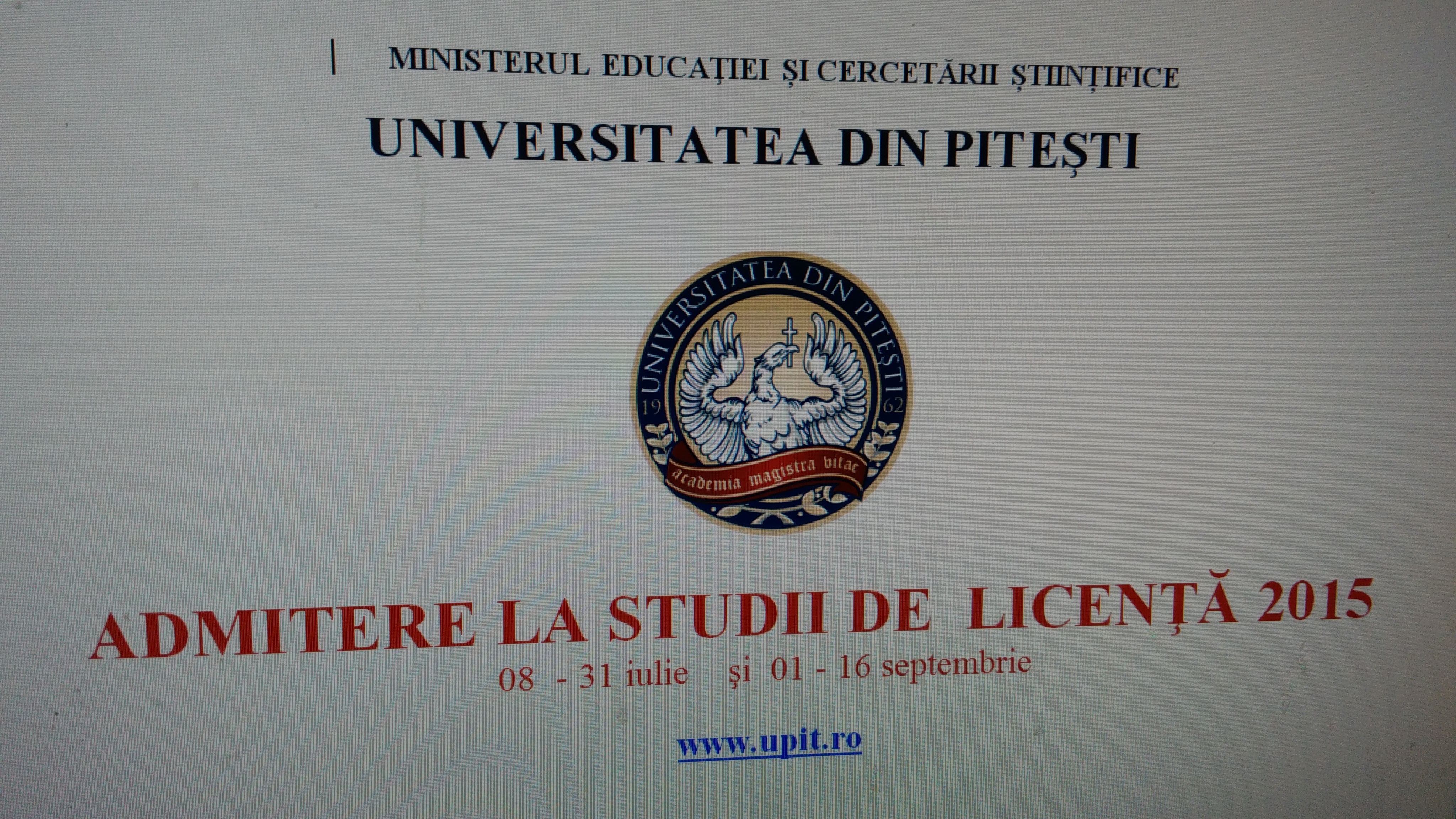 Vezi aici Licenta_2015 (click) calendarul de inscriere la admitere in cadrul UPIT, dar si specializarile disponibile si modul de admitere in concurs, precum si informatii cu privire la intocmirea dosarului.