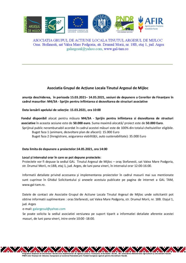 Economie ANUNȚ Asociația Grupul de Acțiune Locală Ținutul Argeșul de Mijloc De ziarulag - March 10, 2021 0 758 Share on Facebook Tweet on Twitter