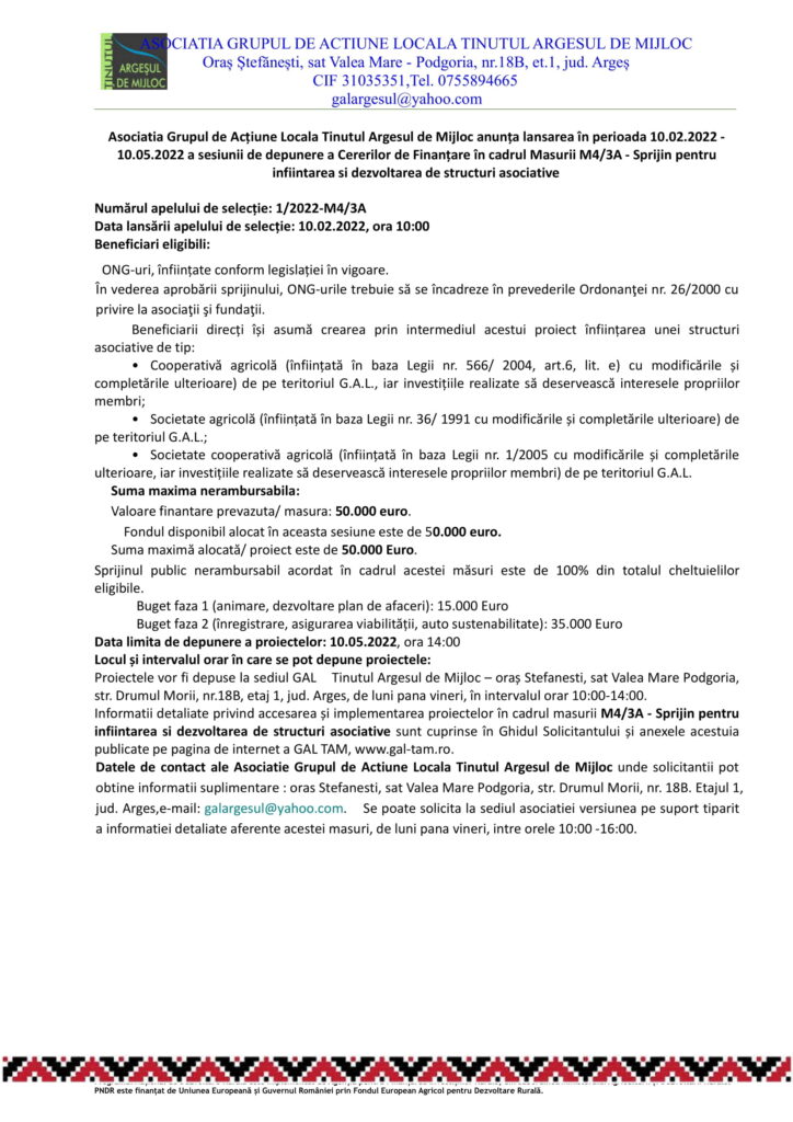 Actualitate ANUNȚ Grupul de Acțiune Locală Ținutul Argeșul de Mijloc De ziarulag - January 31, 2022 0 609 Share on Facebook Tweet on Twitter