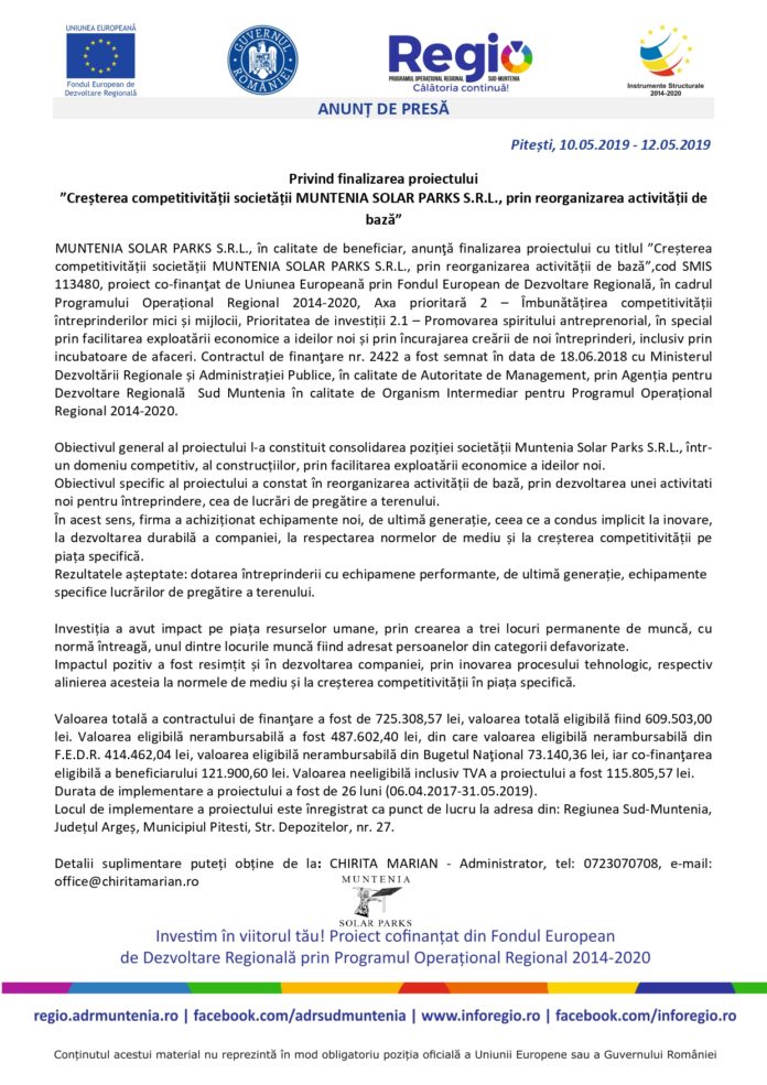 Actualitate ANUNȚ MUNTENIA SOLAR PARKS De ziarulag - May 10, 2019 0 1019 Share on Facebook Tweet on Twitter
