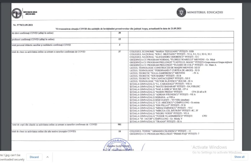 Potrivit Inspectoratului Scolar Judetean Arges, 37 de clase scolare au activitatea suspendata, in judetul Arges, in urma cazurilor confirmate cu COVID 19. Sunt 38 de elevi confirmati cu COVID si 15 profesori, care la acest moment invata in online, mai anunta ISJ Arges.