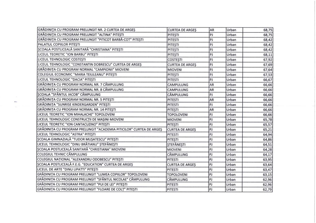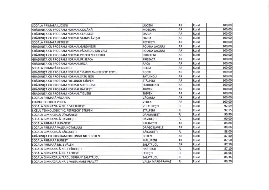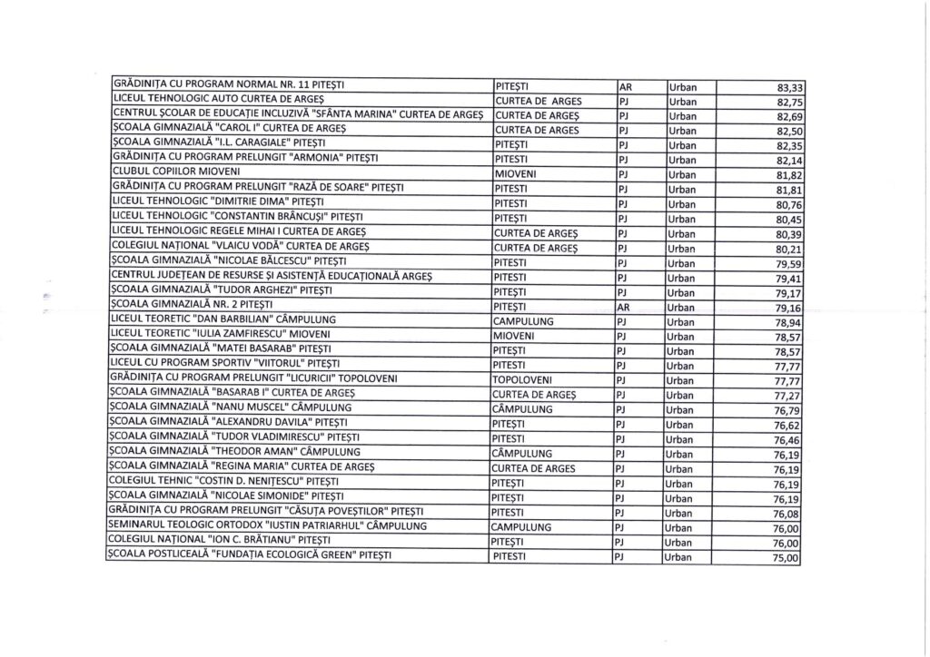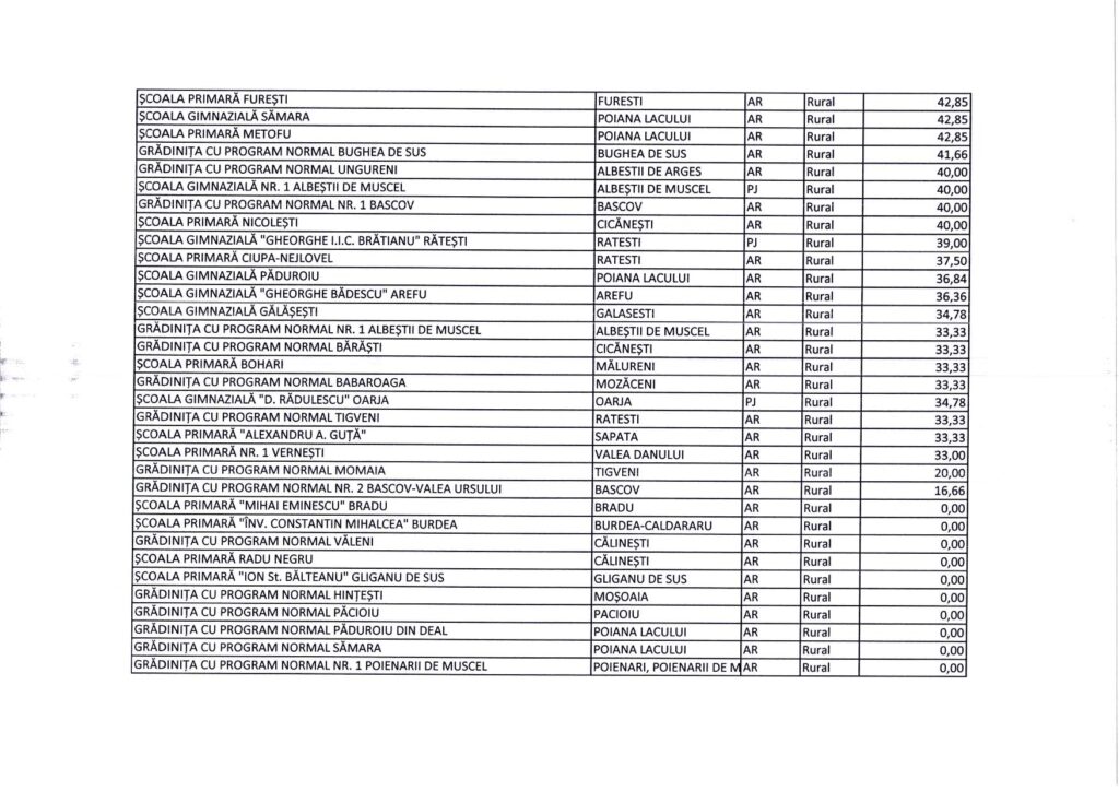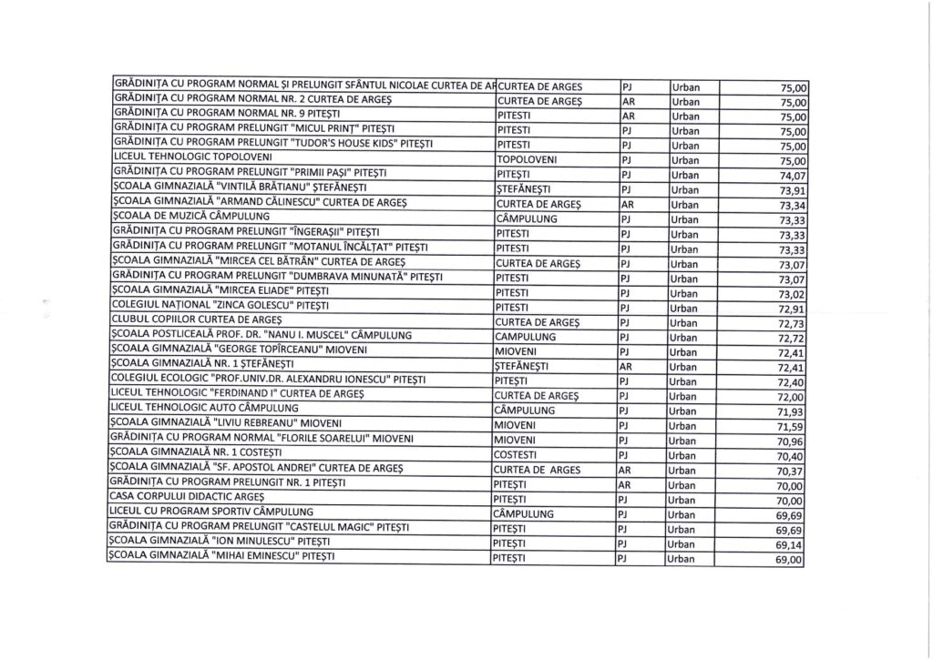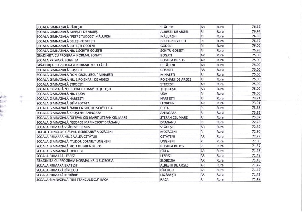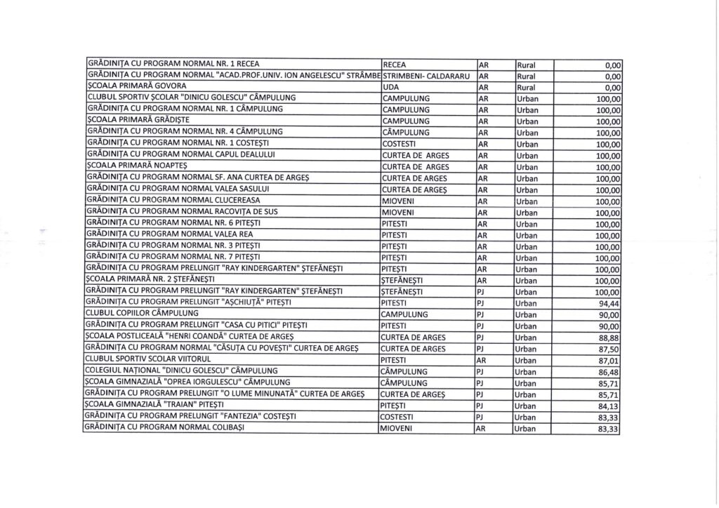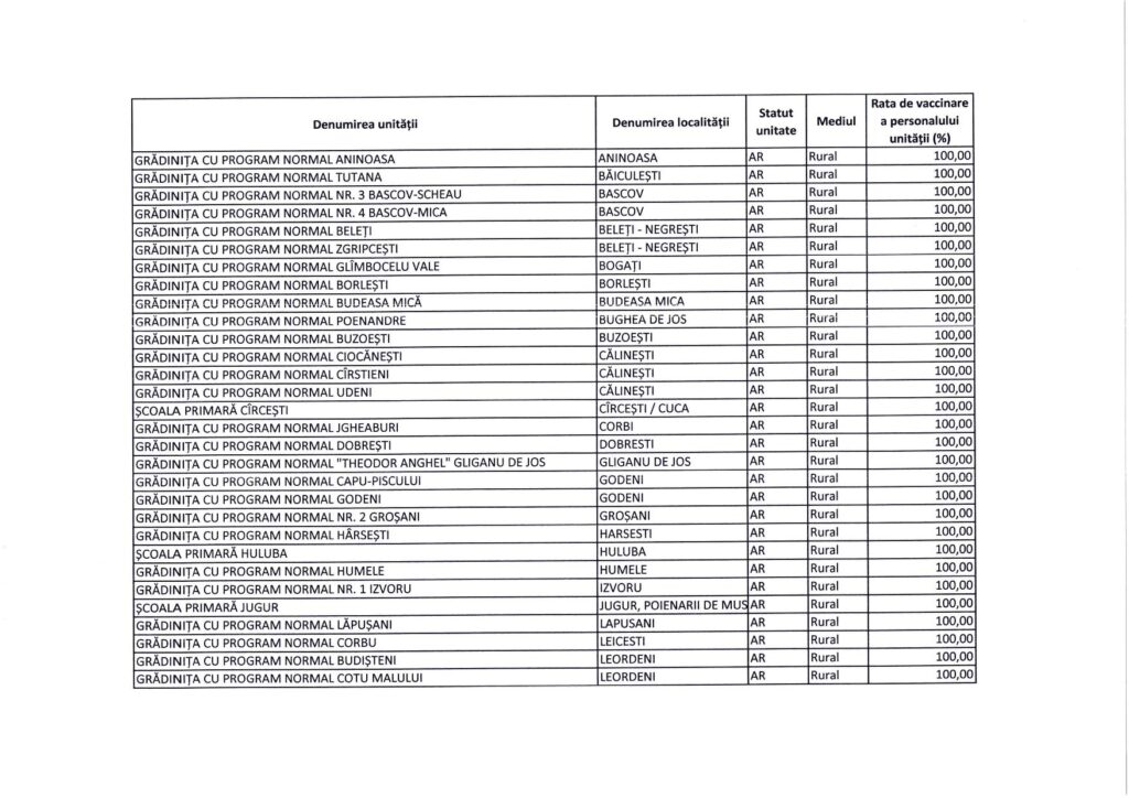 Fata de saptamana trecuta si pana in prezent s-au produs mai multe modificari in scoli, cu privire la lista personalului vaccinat, astfel ca marea majoritatea a unitatilor de invatamant din judet vor functiona in format fizic de saptamana viitoare. De asemenea observam, potrivit listei transmise de catre Prefectura Arges, ca sunt foarte multe unitati scolare, atat din mediul rural, cat si din mediul urban, in care personalul este suta la suta vaccinat. Sunt si scoli in care inca se va invata in format online. Pentru detalii suplimentare consultati urmatoarea lista: