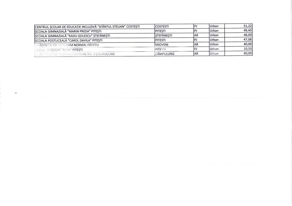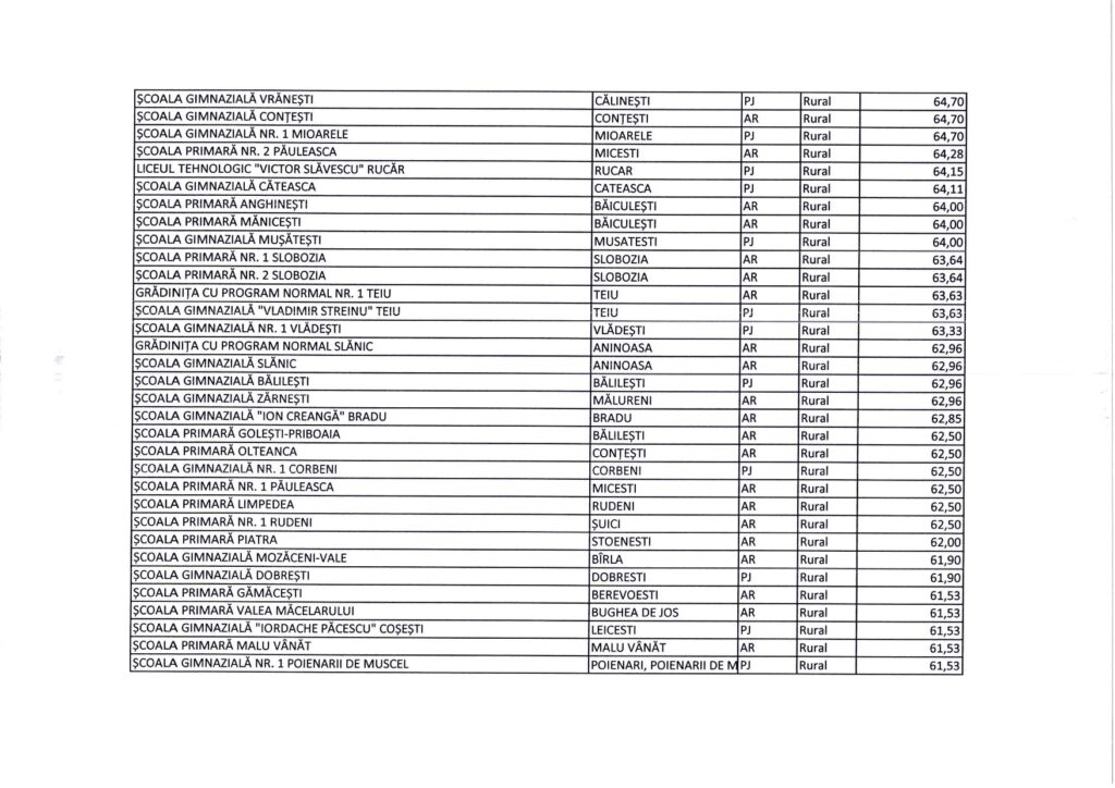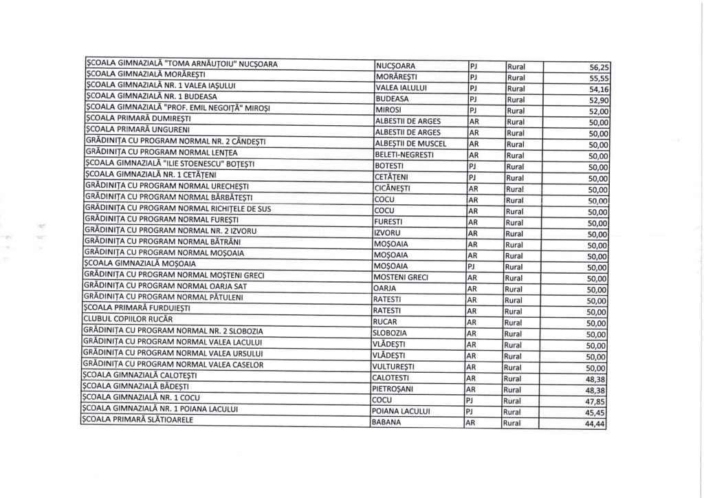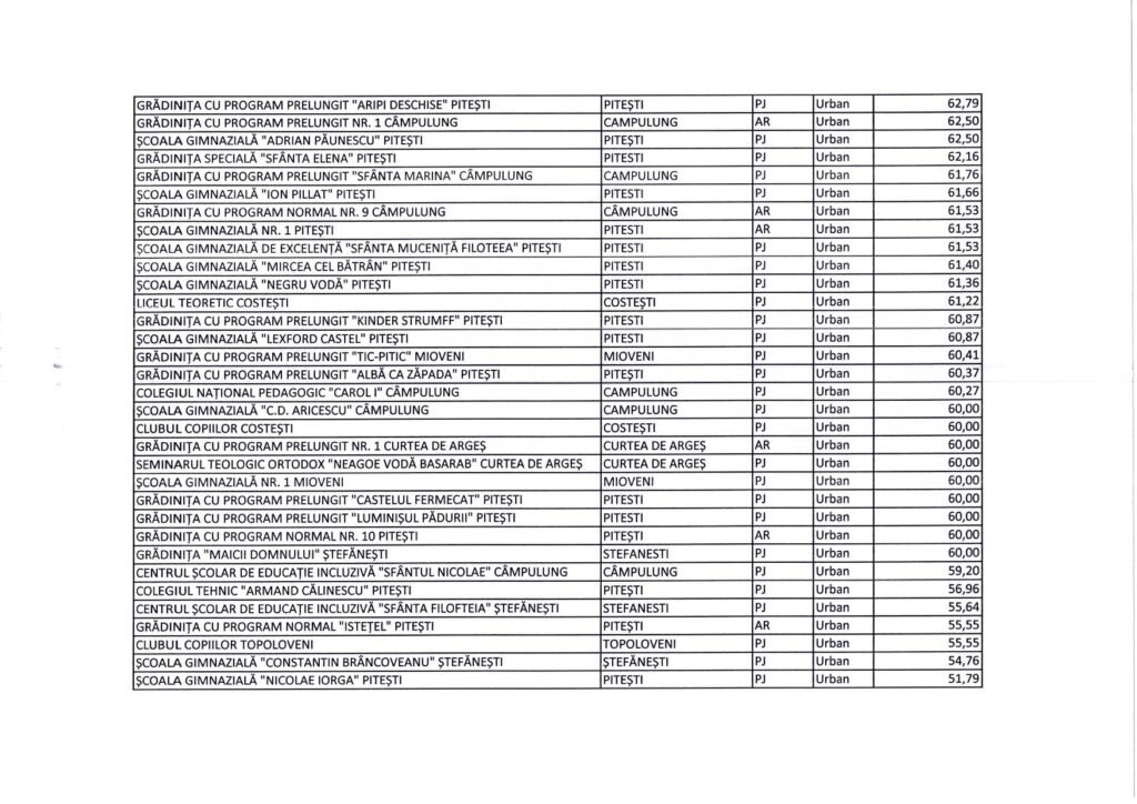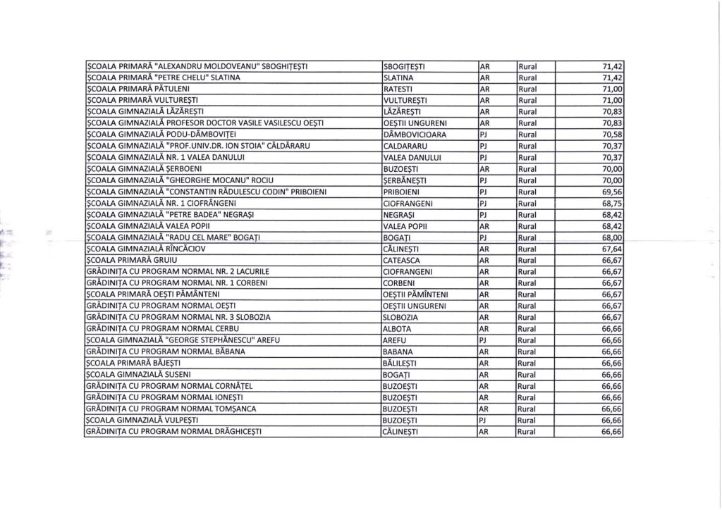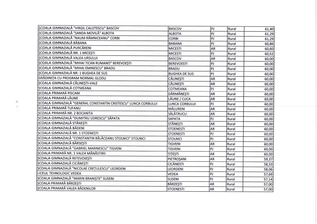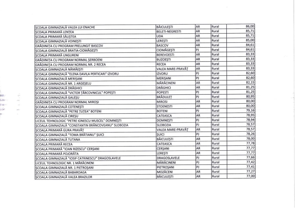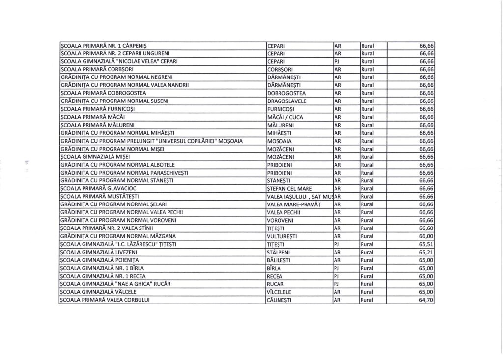Fata de saptamana trecuta si pana in prezent s-au produs mai multe modificari in scoli, cu privire la lista personalului vaccinat, astfel ca marea majoritatea a unitatilor de invatamant din judet vor functiona in format fizic de saptamana viitoare. De asemenea observam, potrivit listei transmise de catre Prefectura Arges, ca sunt foarte multe unitati scolare, atat din mediul rural, cat si din mediul urban, in care personalul este suta la suta vaccinat. Sunt si scoli in care inca se va invata in format online. Pentru detalii suplimentare consultati urmatoarea lista:
