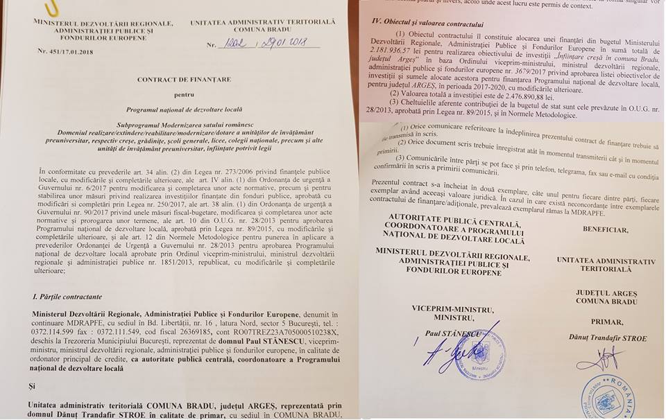 Brădenii au motive de bucurie. Primarul localității, Dan Stroe, a anunțat semnarea contractului pentru înființarea unei creșe în comuna Bradu, proiect ce se va derula în cadrul Programului Național de Dezvoltare Locală 2. Creșa va fi construită în locul vechiului Centru Cultural din Geamăna. ”Am semnat la Ministerul Dezvoltarii Regionale, Administratiei Publice si Fondurilor Europene contractul de finantare pentru realizarea obiectivului “Infiintare cresa in comuna Bradu”. Valoarea totala a investitiei este de 2.476.890 lei.”, a anunțat luni primarul comunei Bradu.