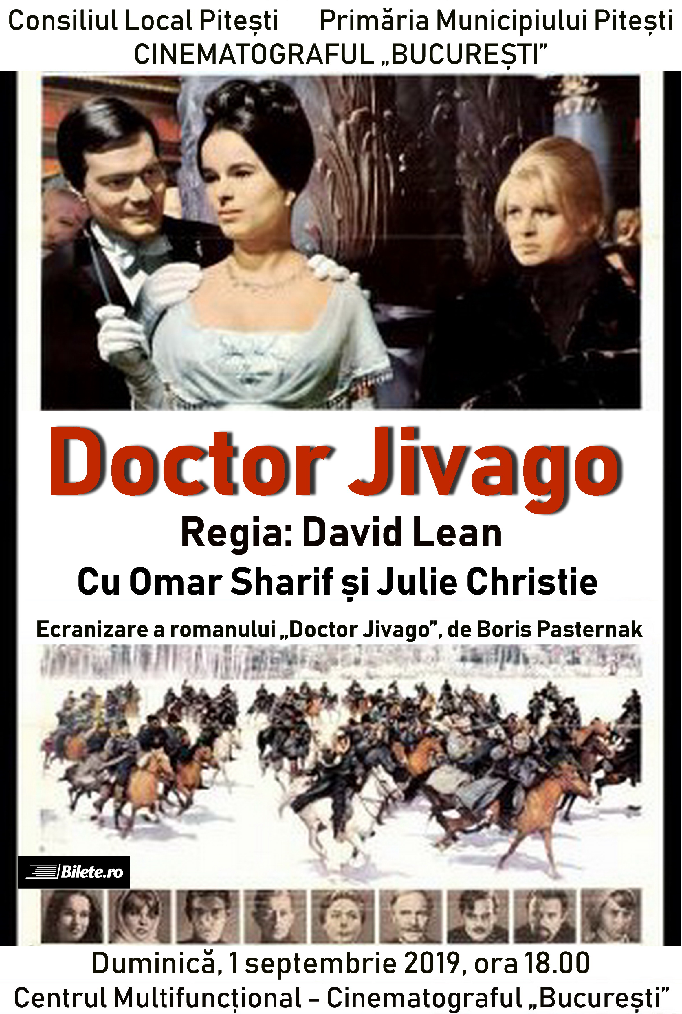 Capodopera „Doctor Jivago”, la Cinematograful „București”. Duminică, 1 septembrie 2019, de la ora 18.00, la Cinematograful de artă „București” va fi difuzat filmul „Doctor Jivago”. Regia îi aparține lui David Lean, în rolurile principale fiind Omar Sharif și Julie Christie.