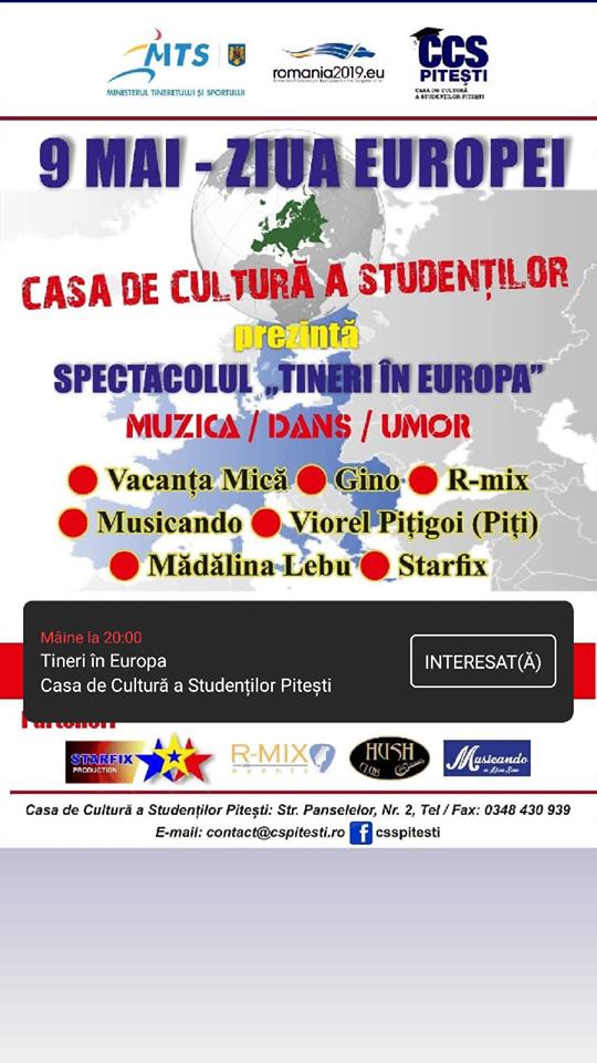 Casa de Cultură a Studenților din Pitești, program spectaculos de Ziua Europei. Astăzi, 9 mai, Casa de Cultură a Studenților din Pitești prezintă spectacolul ”Tineri în Europa”, unde cei care doresc să se alăture programului vor avea parte de muzică dans și mult umor. Printre invitați: Vacanța Mică, Gino, R-Mix, Musicando, Viorel Pițigoi, Mădălina Lebu, Starfix. Spectacolul va avea loc joi, 9 mai, de la ora 20.00.