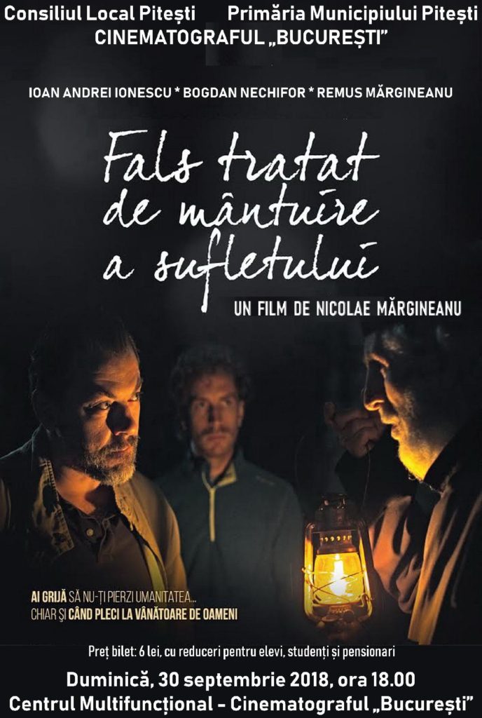 Duminică, 30 septembrie, de la ora 18.00, la Cinematograful „București” difuzăm filmul românesc „Fals tratat de mântuirea sufletului”, în regia lui Nicolae Mărgineanu. În rolurile principale: Ioan Andrei Ionescu, Bogdan Nechifor, Remus Marginean, Maria Ploae, Valentin Uritescu, Cornelia Bloos, Alexandru Georgescu și Mioara Ifrim. Filmul spune povestea lui Toma, inspector la Consiliul Național de Studiere a Arhivelor Securității. „Învățătura” pe care o transmite Toma celui mai tânăr „ucenic” al său este una a răzbunării și amenințărilor, sperând să facă din acest tânăr un „vânător de securiști”. Dar Radu, care nu a trăit pe vremea comunismului, îl pune la îndoială ori de câte ori are ocazia. Este momentul în care echipa Radu-Toma ia contact cu un dosar care pare să aducă în prim-plan nu numai colaborarea cu Securitatea a unei fețe bisericești (părintele Iustin), dar chiar un act criminal. În 1988, un tânăr student trecut la monahism a comis un act de suicid. Toma este convins ca bătrânul călugăr este implicat în sinuciderea novicelui…