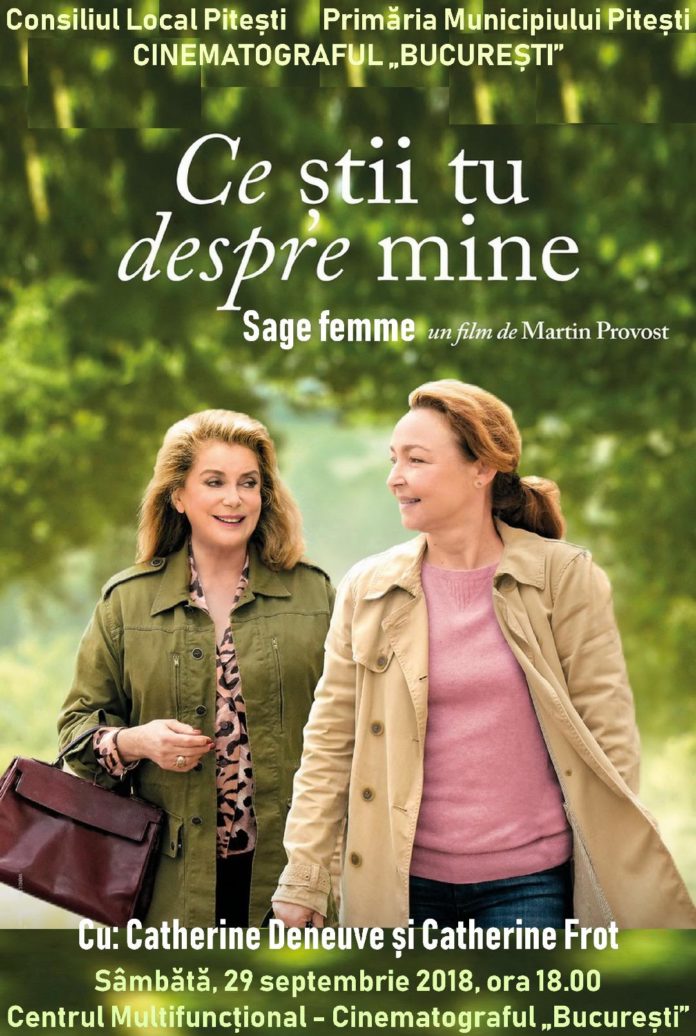 Sâmbătă, 29 septembrie, de la ora 18.00, va fi difuzat la Cinematograful „București” filmul „Ce știi tu despre mine” (titlul original: „Sage femme”). Regia îi aparține lui Martin Provost, în rolurile principale fiind Catherine Deneuve, Catherine Frot, Olivier Gourmet, Quentin Dolmaire și Mylène Demongeot. Filmul spune povestea unei moașe, Claire, care duce o viaţă destul de monotonă, între turele încordate de la spital. Ea ajunge să lege o prietenie deloc aşteptată cu Béatrice, fosta iubită libertină a tatălui său decedat. Deşi cu temperamente opuse, cele două femei vor ajunge să se bazeze una pe cealaltă, după ce Béatrice anunţă că are cancer în fază terminală. Prețul unui bilet este de 8 lei, cu reduceri de 50% pentru studenți și pensionari și de 75% pentru elevi.