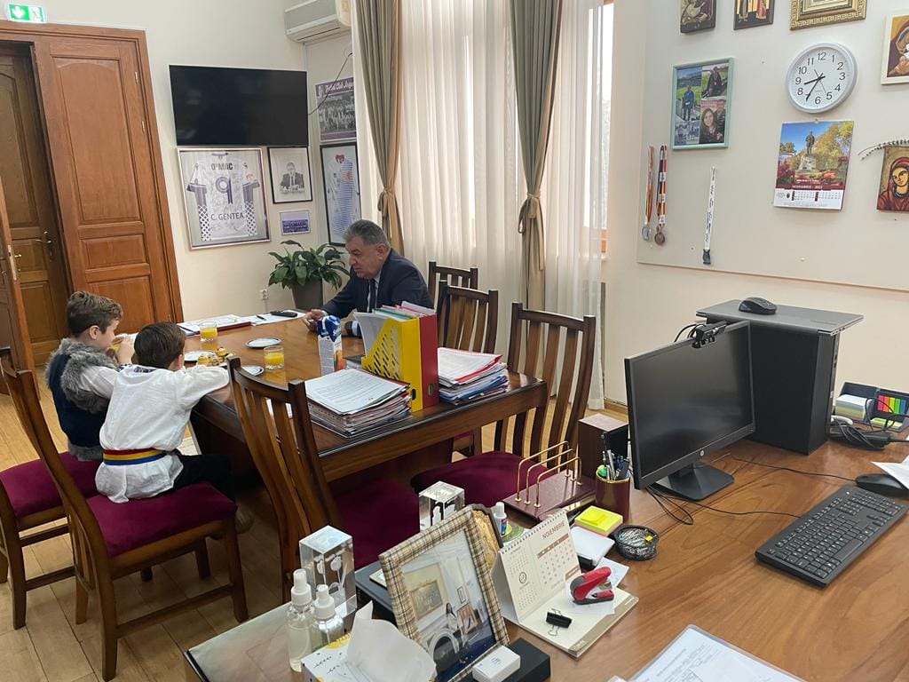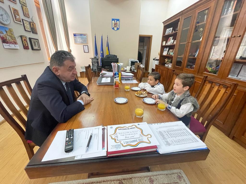 Mulțumesc pentru interviu și felicitări pentru proiect!”, a transmis primarul Cristian Gentea, impresionat de vizita celor doi mici reporteri.