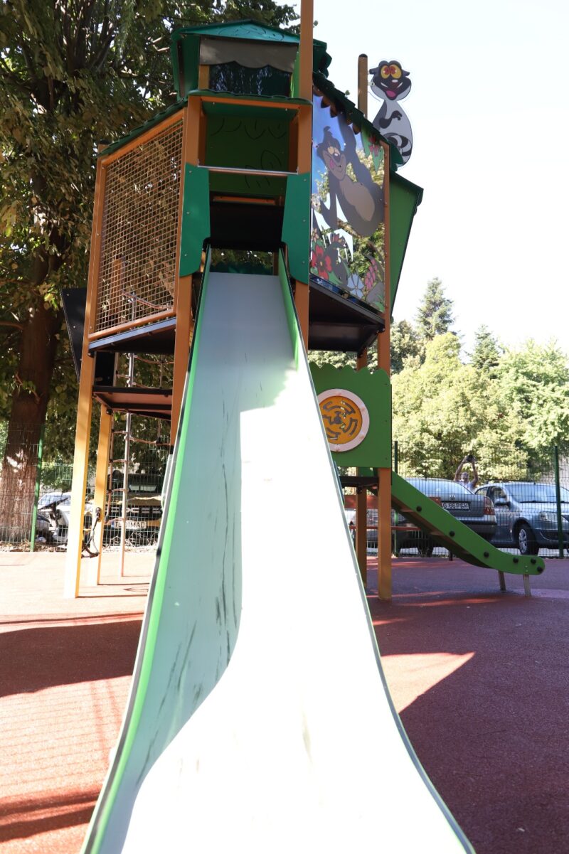 Spațiul este acoperit cu o suprafață elastică din tartan, concepută special pentru a reduce riscul de accidentare în cazul căderilor, iar designul general al locului de joacă a fost gândit pentru a îmbina estetica modernă cu funcționalitatea și siguranța.