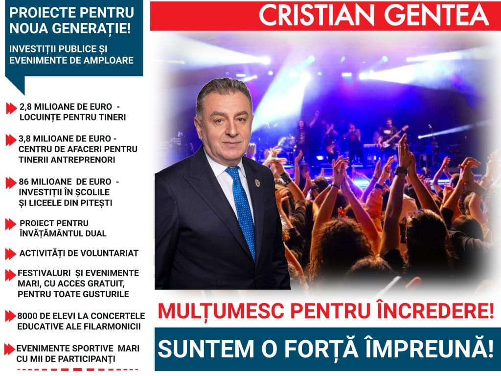 Acționăm ca un oraș deschis către noua generație și suntem receptivi la orice mesaj venit dinspre aceasta pentru a face Piteștiul un municipiu atractiv și cu potențial de dezvoltare pentru tineri!”, este mesajul transmis de primarul municipiului Pitesti, Cristian Gentea.