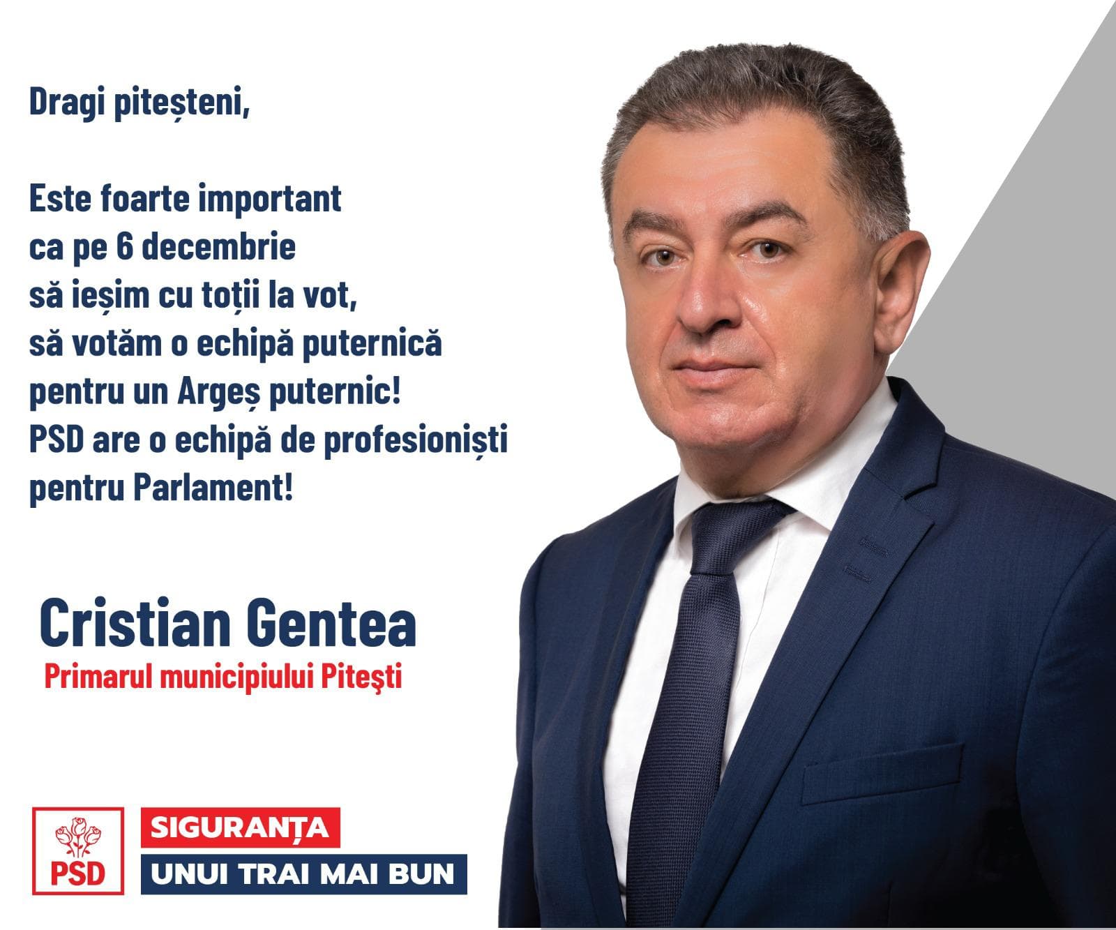 Este foarte important ca pe 6 decembrie să ieșim cu toții la vot! PSD are cea mai bună echipă, formată din profesioniști care au demonstrat în domeniile lor de activitate că știu ce au de făcut. Vor face același lucru și în Parlament! Sunt oameni bine pregătiți, cu cariere ireproșabile și cu dorința de a schimba lucrurile în bine pentru cetățeni. Pe 6 decembrie votăm o echipă puternică pentru un Argeș puternic. Votăm PSD!”, spune Cristian Gentea.