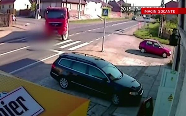 O femeie si baietelul ei de 8 ani au fost spulberati de un camion al carui sofer nu a vazut ca pietonii incepusera sa traverseze. Accidentul a fost surprins de o camera de supraveghere, iar imaginile sunt extrem de dure. Camionul urma sa intre pe un drum cu prioritate si s-a oprit la intersectie. A asteptat sa treaca masinile care circulau pe soseaua principala si, cand s-a eliberat calea, a pornit de pe loc si a virat dreapta.