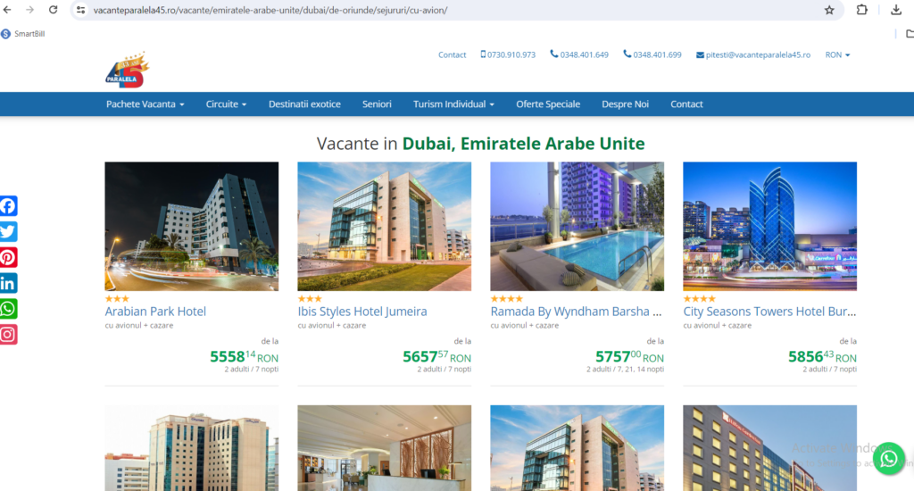 In acest sens, ne-a oferit si cateva exemple de oferte cu destinatia Dubai. Astfel, pentru plecarea din 03.04.2024/7 nopti poti beneficia de un hotel bun, transfer si bilet avion la oferta de 660 eur/pers – Hotel Millenium Place Barsha Heights sau Ramada by Wyndham Barsha Heights, cu 689 eur/persoana cu mic dejun; Hotel Grand Excelsior Bur Dubai, cu 599 euro/persoana, cu mic dejun, bilet de avion si transfer inclus; Tryp by Wyndham Dubai: 689 eur/persoana, Hotel Wyndham Dubai Marina: 900 euro/persoana, de asemenea cu mic dejun, bilet de avion si transfer inclus.