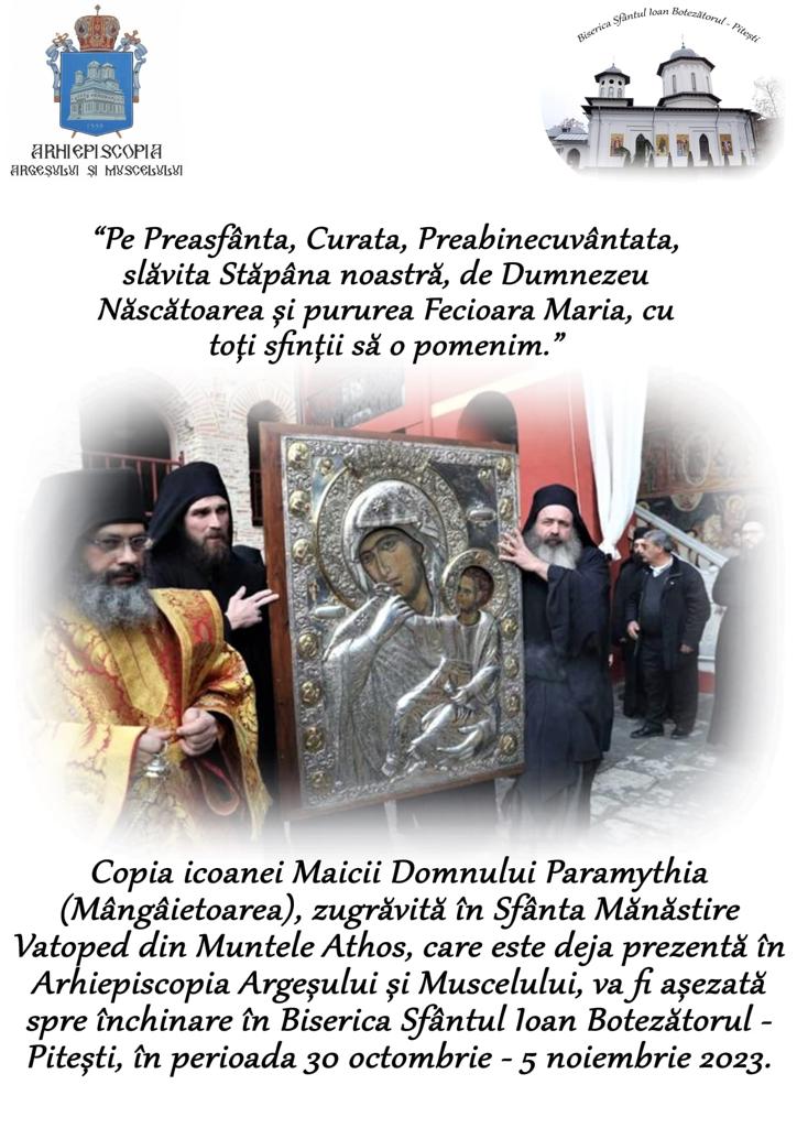 Icoana Maicii Domnului numită “Mângâietoarea”, de pe Sfântul Munte Athos, din nou la Pitesti. In aceasta seara, de la ora 18.30, va fi asezata spre inchinare in Biserica Sfantul Ioan Botezatorul din Pitesti si va ramane pana duminica, 5 noiembrie.