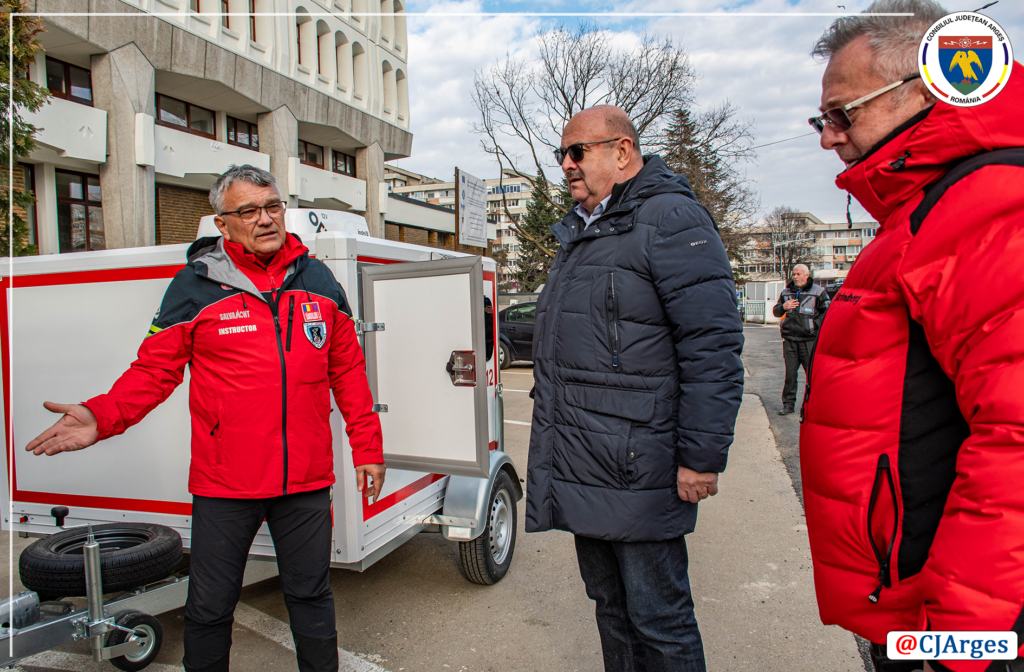 “La dotarea pe care am primit-o de la Consiliul Județean, la începutul anului trecut, se adaugă încă două autospeciale, două Jeep-uri dotate fiecare cu câte o remorcă climatizată pentru transport câini. Județul Argeș a beneficiat de două ansambluri care au venit complet utilate – girofar, proiectoare reglabile, dotate cu targă specială, set de atele, defibrilator, tot ceea ce înseamnă primul ajutor calificat. Scaunele din spate se rabatează și există un sistem pe care se poate prinde acea targă astfel încât accidentatul să poată fi transportat până la ambulanță. Remorca de transport câini este o inițiativă a Salvamont Argeș. Proiectul nostru cu unitățile canine a prins contur în 2016, iar în 2017 am solicitat conducerii DSU ca 10 dintre mașini să fie dotate și cu remorci pentru transport câini. Între timp, sunt 26 de câini operaționali în 14 județe din țară.