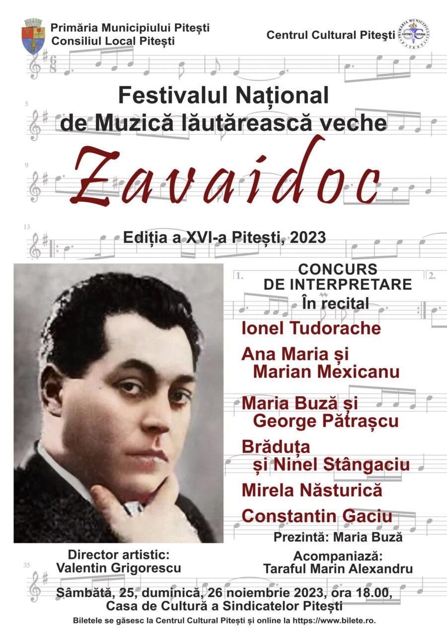 Sâmbătă, 25 noiembrie, și duminică, 26 noiembrie, începând cu ora 18:00, la Casa de Cultură a Sindicatelor din Pitești va avea loc ediția a 16-a a Festivalului Național de Muzică Lăutărească Veche „Zavaidoc” – eveniment organizat de Primăria Municipiului Pitești și de Consiliul Local, prin Centrul Cultural Pitești.