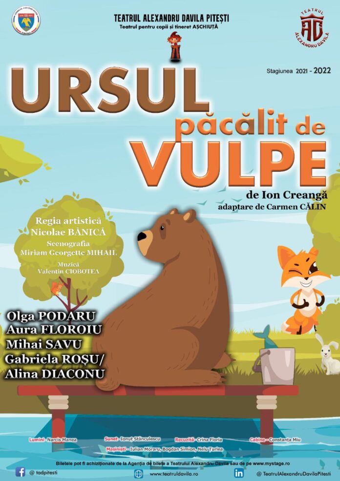 Spectacolul ”Ursul păcălit de vulpe”, una dintre cele mai cunoscute povești, scrisă de Ion Creangă, cu care multe generații de copii au crescut. Povestea îi are în rolurile principale pe vulpea cea șireată și pe ursul cel mereu înfometat. La baza acestei povești se află și o morală, iar noi, Teatrul pentru copii și tineret ”Așchiuță”, îi așteptăm pe cei mici la spectacol ca să o descopere!”, informeaza Teatrul Davila Pitesti.