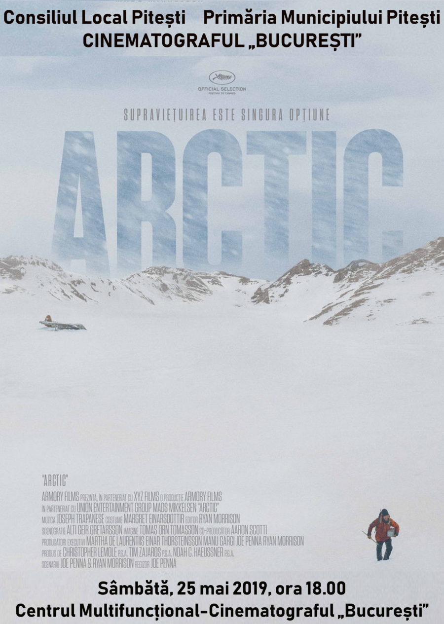 Sâmbătă, 25 mai 2019, de la ora 18.00, la Cinematograful de artă „București” va fi proiectat filmul islandez „Arctic”. Regia îi aparține lui Joe Penna, în rolul principal fiind Mads Mikkelsen. Naufragiat în pustietatea arctică, Overgård (Mads Mikkelsen) este pe punctul de a fi salvat după lungi așteptări. Însă, în urma unui tragic accident, ocazia salvării este pierdută. Bărbatul trebuie acum să decidă dacă își va aștepta sfârșitul în relativa siguranță a taberei în care se află, sau va încerca să se salveze pornind într-o cursă mortală prin necunoscutul înghețat. Prețul unui bilet la „Arctic” este de 8 lei, cu reduceri de 50% pentru studenți și pensionari și de 75% pentru elevi.