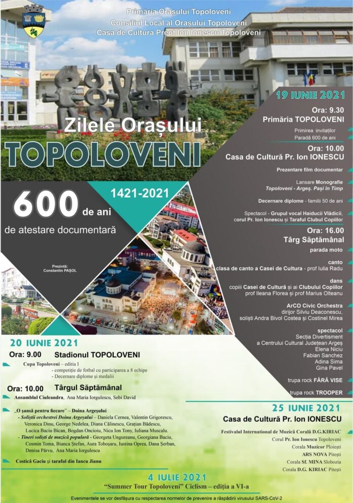 Orașul TOPOLOVENI este un oraș unde Tradițiile, Credința și Progresul se întâlnesc și se unesc în armonie. 600 de ani de atestare documentară împlinește orașul Topoloveni, astfel ca zilele urmatoare au loc o serie de manifestari pentru a marca acest mare eveniment pentru topoloveneni.