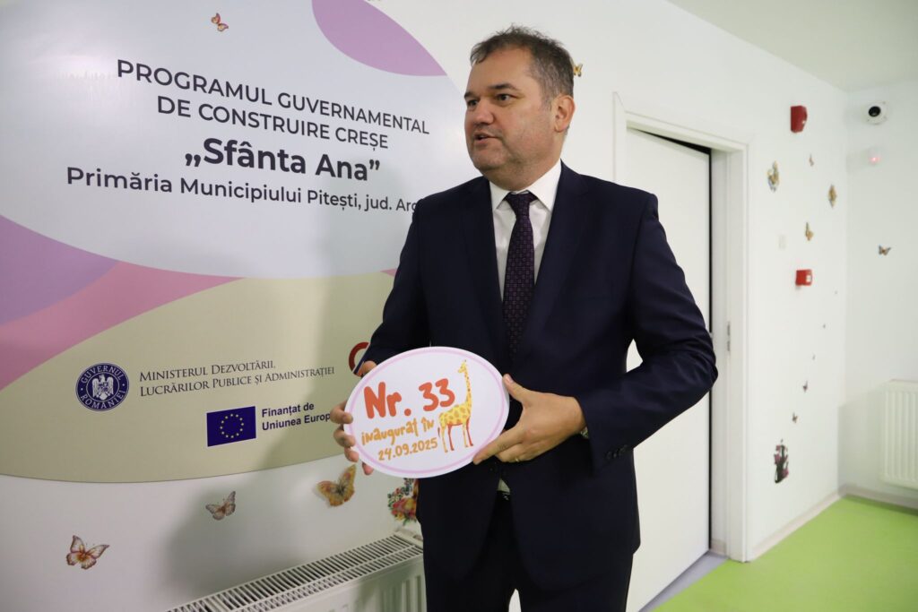 Astăzi, 24 septembrie 2025, la Pitești, a avut loc inaugurarea noii creșe construite pe bulevardul Eroilor, nr. 26-28, în curtea Colegiului Economic „Maria Teiuleanu”. La eveniment au participat ministrul Cseke Attila, inițiatorul acestui amplu program național de construcție a creșelor, primarul municipiului Pitești, Cristian Gentea, prefectul judetului, Ioana Facaleata, precum și alți reprezentanți ai administrației locale.