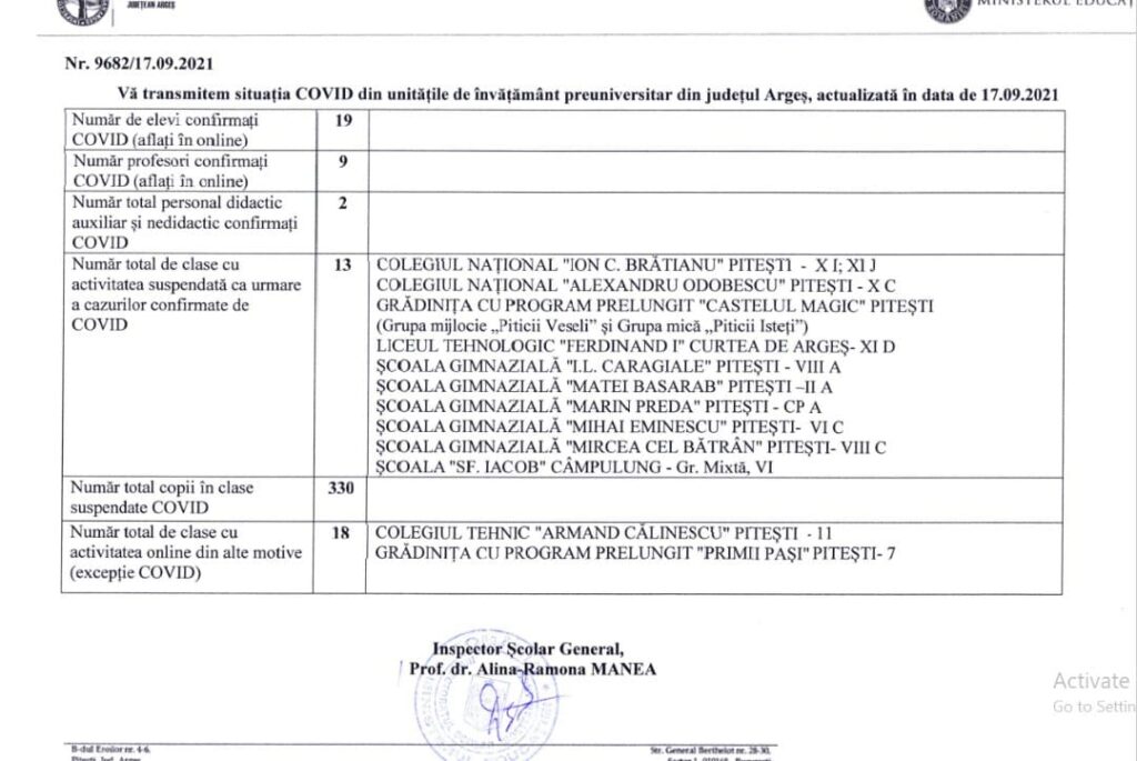 Sunt 19 elevi confirmati cu COVID, in judetul Arges, care la acest moment studiaza in mediul online, si 9 profesori care de asemenea au fost confirmati pozitiv cu COVID. Potrivit Inspectoratului Scolar Judetean Arges, sunt 2 persoane din cadrul personalului didactic auxiliar si nedidactic confirmate cu COVID. Sunt 13 clase care au cursurile suspendate ca urmare a cazurilor confirmate cu COVID (lista cu unitatile de invatamant care au clase cu activitatea suspendata o puteti urmari in tabelul de mai jos), clase in care invata 330 de elevi. De asemenea, sunt si alte clase scolare care au activitatea suspendata din alte motive, acestea fiind in numar de 18 (vezi lista in tabel), mai anunta ISJ Arges.