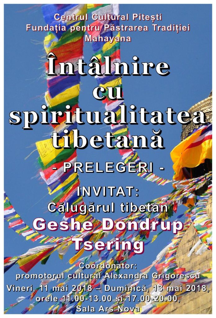 Centrul Cultural Pitești și Fundația pentru Păstrarea Tradiției Mahayana organizează prelegeri sub genericul „Întâlnire cu spiritualitatea tibetană”, avându-l invitat pe călugărul tibetan Geshe Dondrup Tsering. Dezbaterile tematice, coordonate de promotorul cultural Alexandra Grigorescu se vor desfășura la Centrul Cultural Pitești, în Sala Ars Nova, după următorul program: