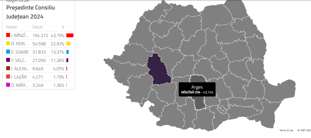 Ion Minzina a castigat presedintia Consiliului Judetean Arges, cu 43,79%, dupa cum arata rezultatele partiale la alegerile locale din 9 iunie. Astfel, candidatul social democrat este urmat in clasament de Radu Perianu (PNL) cu 22,93%, Emanuel Soare, candidatul Aliantei Dreapta Unita, cu 13,37% si Florin Bogdan Velcescu, avand 11,36% din voturile valabil exprimate.