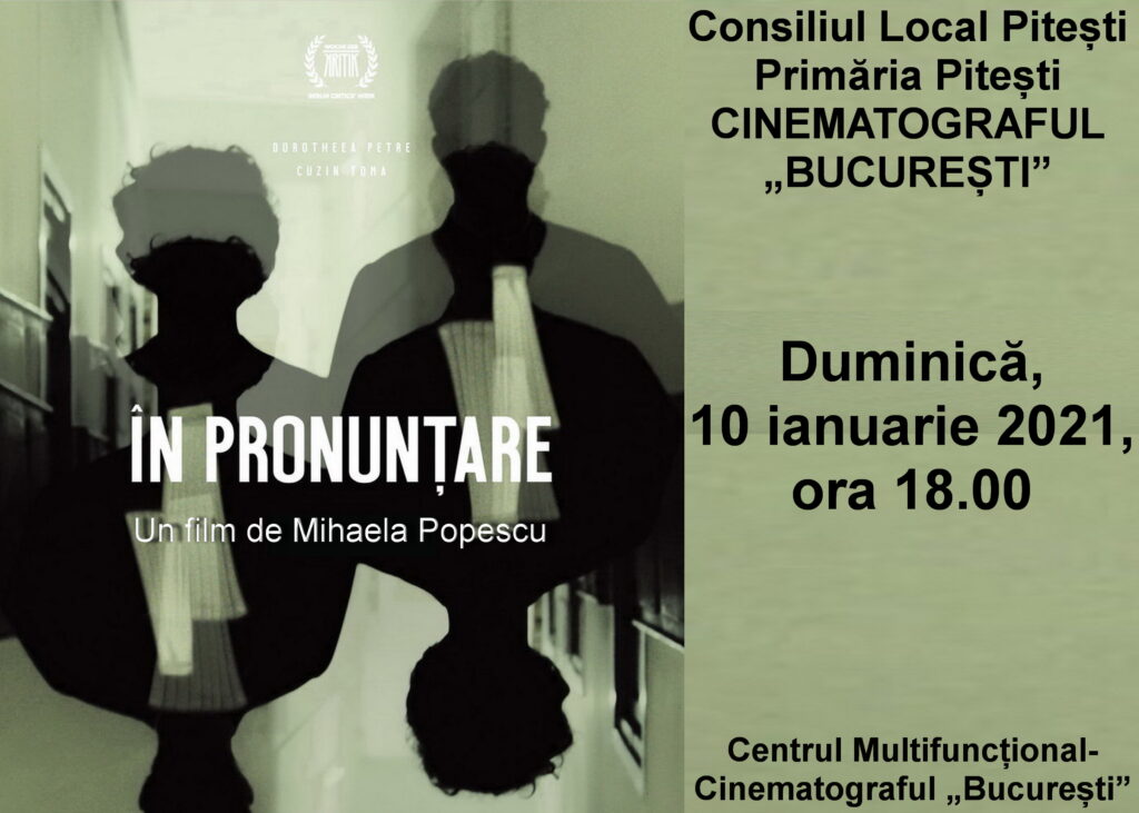 Duminică, 10 ianuarie 2021, de la ora 18.00, difuzăm la Cinematograful „București” filmul românesc „În pronunțare”. Regia îi aparține Mihaelei Popescu, în rolurile principale jucând Dorotheea Petre, Cuzin Toma și Olimpia Melinte.