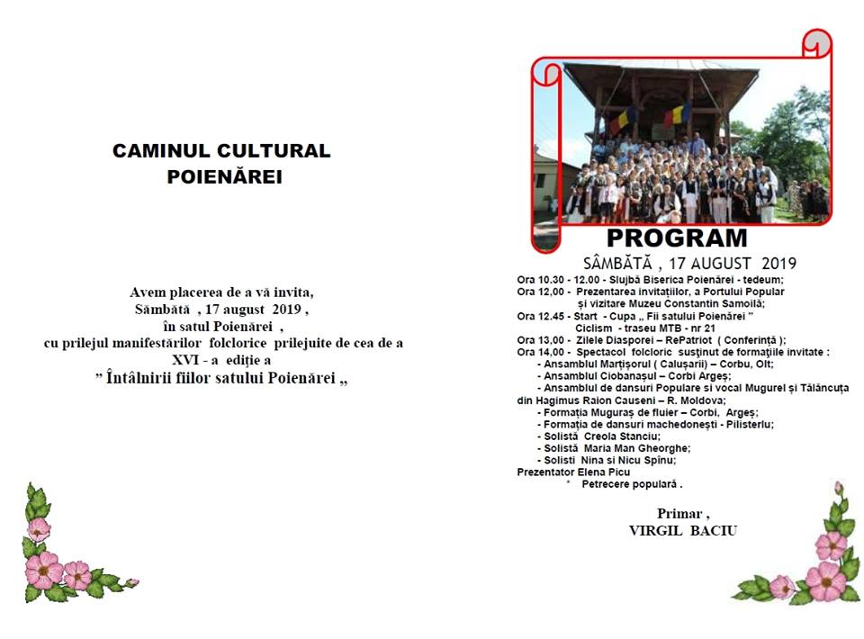 Primarul comunei Virgil Baciu vă invită la manifestările folclorice prilejuite de ”Întâlnirea fiilor satului Poienărei”, eveniment ce debutează în jurul orei 10.30 cu o slujbă la Biserica Poienărei. Ulterior va fi o paradă impresionantă pentru că va fi prezentat portul popular, va avea loc o vizită la Muzeul Constantin Samoilă, după care se va da startul Cupei ”Fiii satului Poienărei” Ciclism traseu MTB – nr. 21. De la ora 13.00 va avea loc și o conferință – Zilele Diasporei – RePatriot, pentru ca după ora 14.00 să aibă loc un spectacol folcloric susținut de mai multe formații invitate.