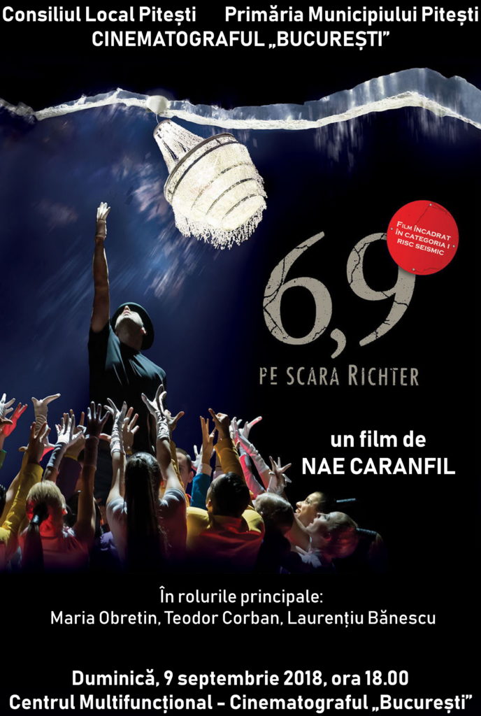 Duminică, 9 septembrie, de la ora 18.00, la Cinematograful „București” difuzăm filmul românesc „6,9 pe scara Richter”, în regia lui Nae Caranfil. În rolurile principale: Maria Obretin, Teodor Corban și Laurențiu Bănescu. Filmul spune povestea unui tânăr actor care pendulează între un rol complicat dintr-un spectacol de „musical”, o nevastă geloasă până la depresie și obsesia marelui cutremur devastator, anunțat ca iminent de toți „experții”. Însă „adevăratul” cutremur pentru el se dovedește a fi reapariția intempestivă a propriului său tată, după decenii de absență. Tony-actorul, soția sa instabilă psihic, tatăl hedonist și frumoasa iubită a acestuia evoluează împreună într-un „cadril” tragi-comic, în așteptarea unui dezastru seismic și a unei premiere teatrale unde, cel puțin în intenții, „toată lumea râde, cântă și dansează”…