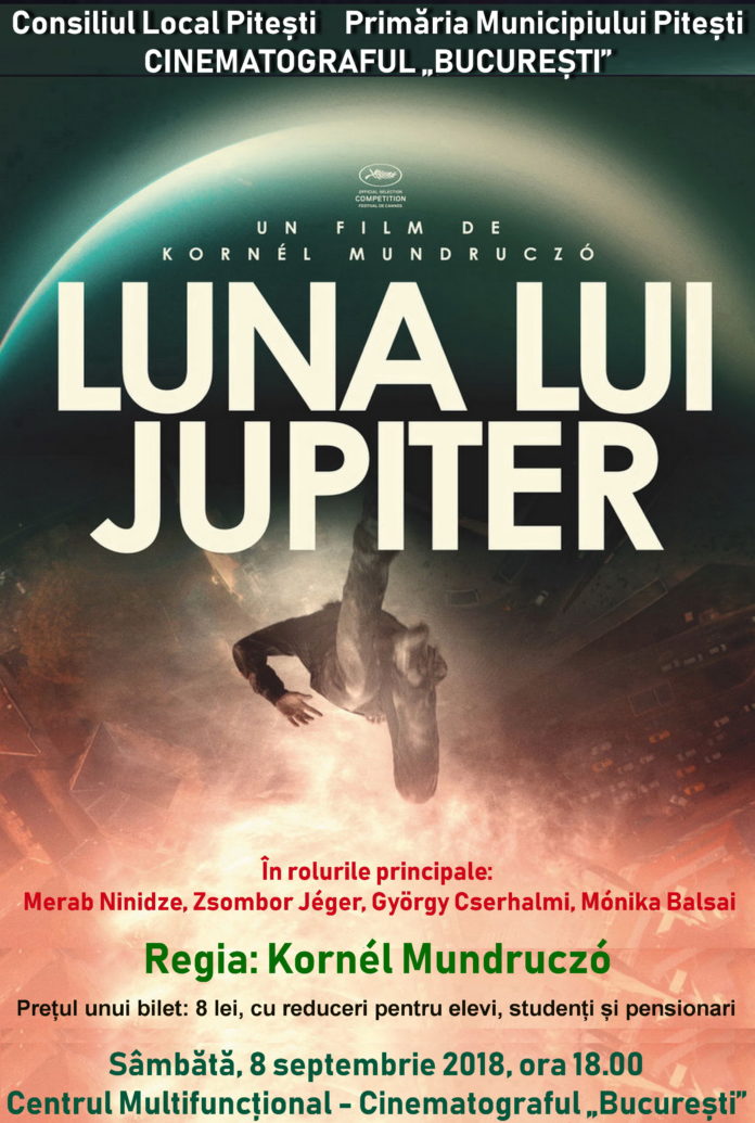 „Luna lui Jupiter” și „6,9 pe scara Richter”, filmele acestui weekend la Cinematograful „București”. Sâmbătă, 8 septembrie, de la ora 18.00, va fi difuzat la Cinematograful „București” filmul „Luna lui Jupiter” (titlul original: „Jupiter holdja” ), în regia lui Kornél Mundruczó. În rolurile principale: Merab Ninidze, Zsombor Jéger, György Cserhalmi și Mónika Balsai. Filmul spune povestea unui tânăr emigrant care este împușcat în timp ce trecea ilegal frontiera. Sub șocul rănii provocate, Aryan (Zsombor Jéger) descoperă că are acum puterea de a levita. Aruncat într-o tabără de refugiați, el scapă cu ajutorul doctorului Stern (Merab Ninidze), motivat de intenţia de a-i exploata secretul extraordinar. Cei doi bărbați evadează în căutare de bani și de siguranţă, fiind urmăriţi de un comisar. Fascinat de darul incredibil al lui Aryan, Stern decide să mizeze totul pe o lume în care miracolele se cumpără.
