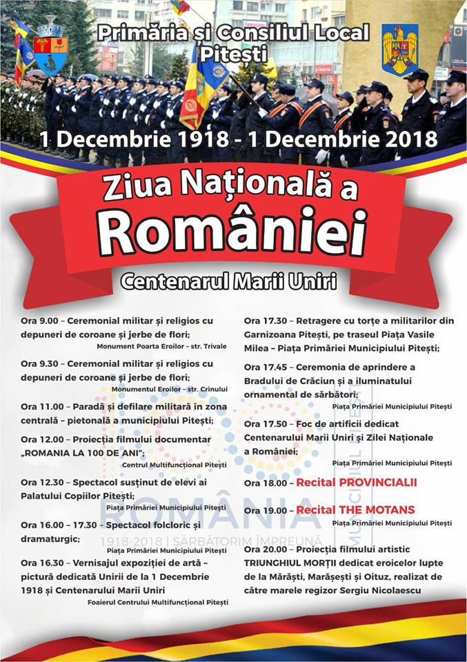 ”Vă invităm să fiți alături de noi într-o zi de mare sărbătoare, Centenarul Marii Uniri și să participați la evenimentele organizate cu acest prilej! Haideți să petrecem împreună!”, a transmis conducerea Primăriei Pitești.