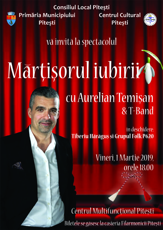 Aurelian Temișan & T-Band, în spectacol la Pitești, de Mărțișor. Evenimentul, intitulat ”Mărțișorul iubirii”, va avea loc la Centrul Multifuncțional Pitești, vineri, 1 martie, de la ora 18.00. Biletele sunt puse în vânzare la casieria Filarmonicii Pitești. În deschiderea evenimentului vor cânta Tiberiu Hărăguș și Grupul Folk P620.