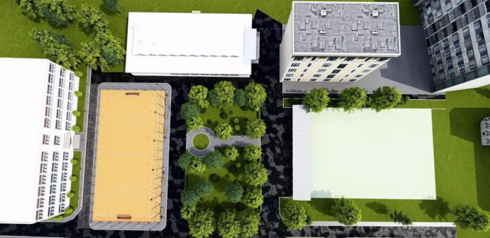• teren de handbal cu suprafață de joc din tartan, cu alei pietonale din dale de beton prefabricat;