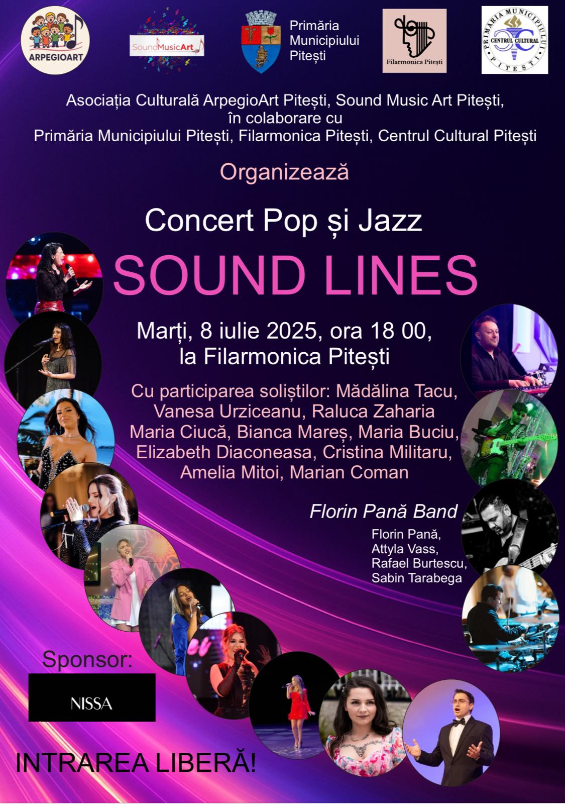 Nu ratați o seară plină de emoție, muzică live și momente de neuitat! Marți, 8 iulie 2025, de la ora 18:00, Asociația Culturală „ArpegioArt” Pitești și Școala de Muzică și Teatru „Sound Music Art” Pitești, în parteneriat cu Primăria Municipiului Pitești, Filarmonica Pitești și Centrul Cultural Pitești, vă invită la un concert special dedicat muzicii pop și jazz – SOUND LINES!