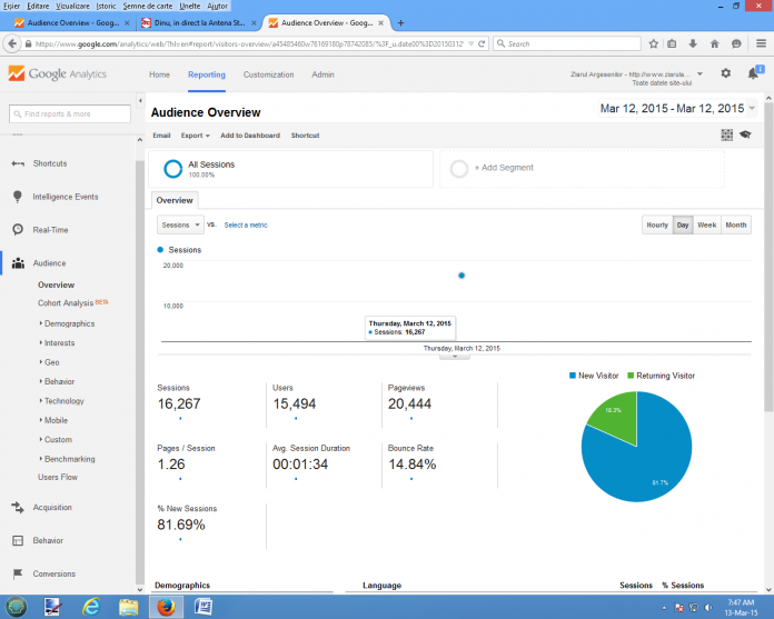 Ziarulargesenilor.ro, in topul preferintelor miilor de argeseni. Ieri, 12 martie, numarul cititorilor nostri s-a dublat comparativ cu recordul inregistrat in data de 10 martie, astfel ca Ziarulargesenilor.ro a inregistrat 15.494 de vizitatori unici pe site (vezi grafic). Potrivit Google analytics, 15.494 de vizitatori unici au urmarit stirile editate de redactorii ziarului nostru, in data de 12 martie, iar pentru asta le multumim. Pe piata media online din judetul Arges, Ziarulargesenilor.ro s-a situat pe primul loc in functie de numarul de vizitatori unici inregistrati.