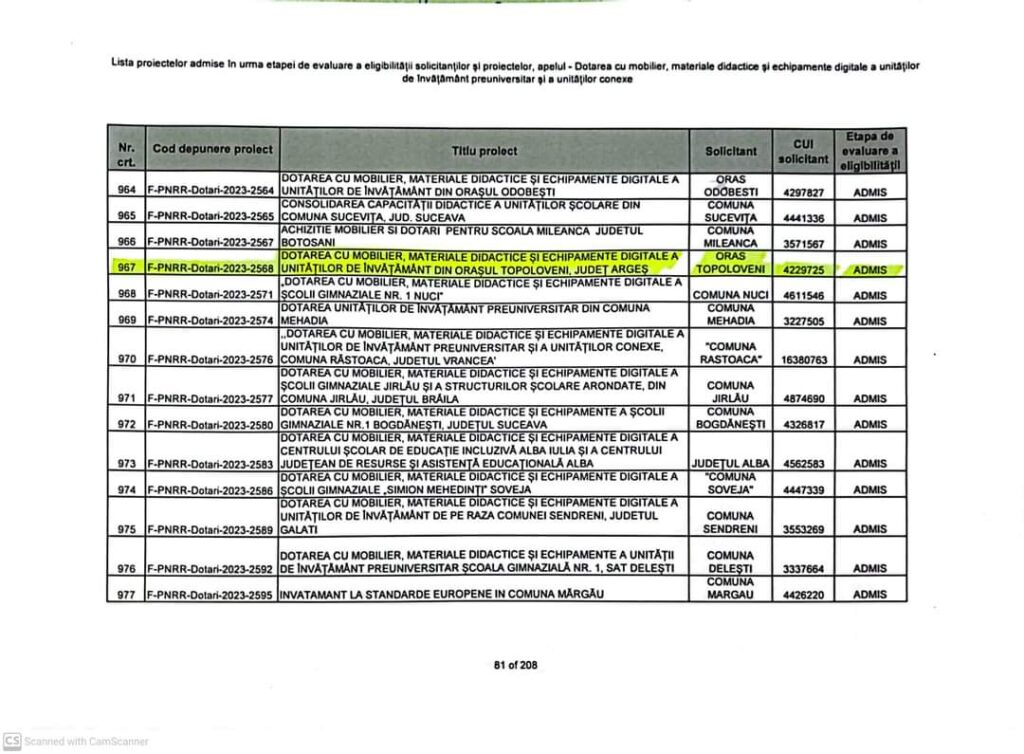 “Proiectul privind “Dotarea cu mobilier, materiale didactice si echipamente digitale a unitatilor de invatamant preuniversitar si a unitatilor conexe” ce vizeaza unitatile de invatamant din orasul Topoloveni: Liceul Teoretic Ion Mihalache, Liceul Tehnologic Topoloveni, Clubul Copiilor Topoloveni, Gradinita cu program prelungit Lumea copiilor Topoloveni a fost ADMIS spre finantare prin PNRR. Valoarea proiectului 3.567.117,42 lei.”, transmite primaria Topoloveni.