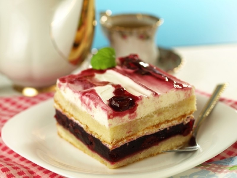 Pentru prajitura delicioasa cu fructe se amesteca uleiul, zaharul, ouale, sucul de rosii, bicarbonatul de sodiu, bicarbonatul de amoniu stins in zeama de lamaie, pana se topesc cristalele de zahar. Se adauga faina, se framanta bine, se lasa in repaus circa 15 minute si se intind foi subtiri, pudrand cu faina. Se introduc in cuptor pe o tava pudrata cu faina la temperatura moderata cam 4-5 minute, apoi se lasa la racit.