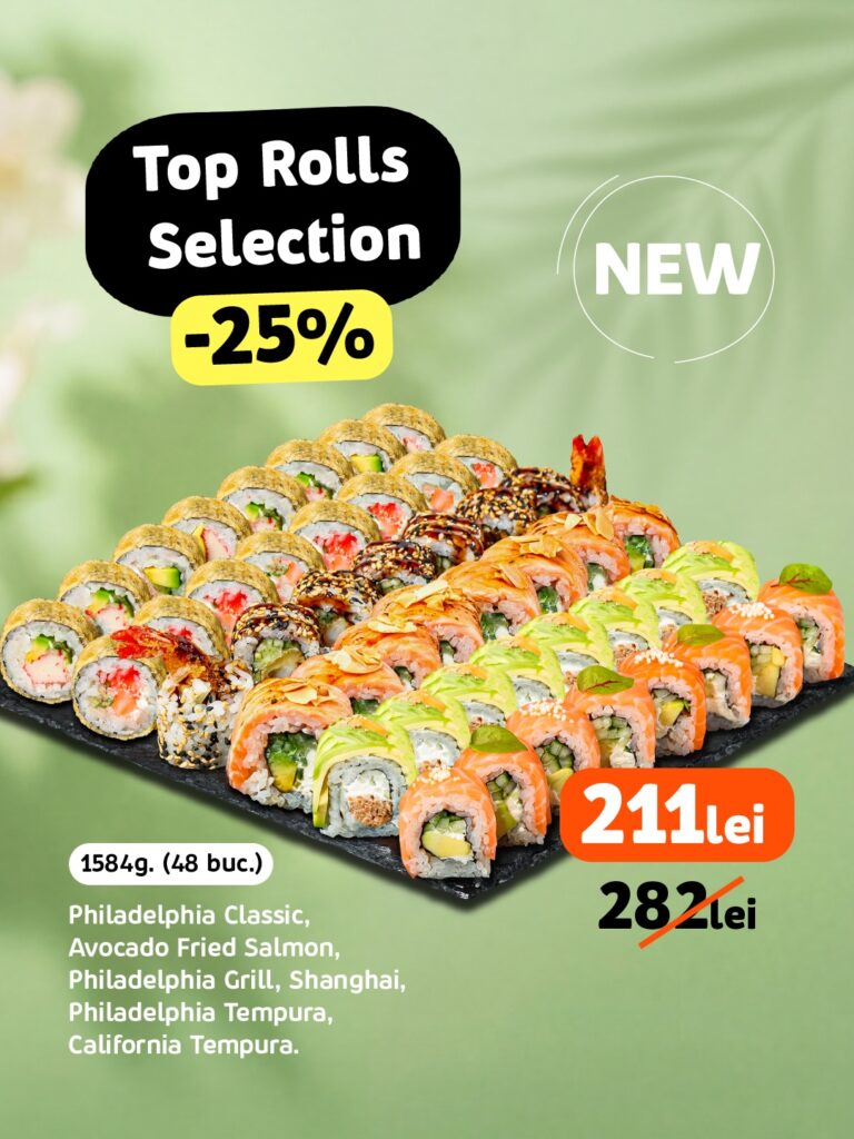 op Rolls Selection Set este alegerea ideală pentru cei care nu se pot decide la un singur tip de sushi. Cu 48 de bucăți (1584g), acest platou include combinații precum Philadelphia Classic, Avocado Fried Salmon, Philadelphia Grill, Shanghai, Philadelphia Tempura și California Tempura. Fiecare roll aduce un echilibru între cremozitatea brânzei, prospețimea peștelui și textura crocantă a variantelor tempura. În plus, setul este acum la un preț special: redus cu 25%, de la 282 lei la doar 211 lei.