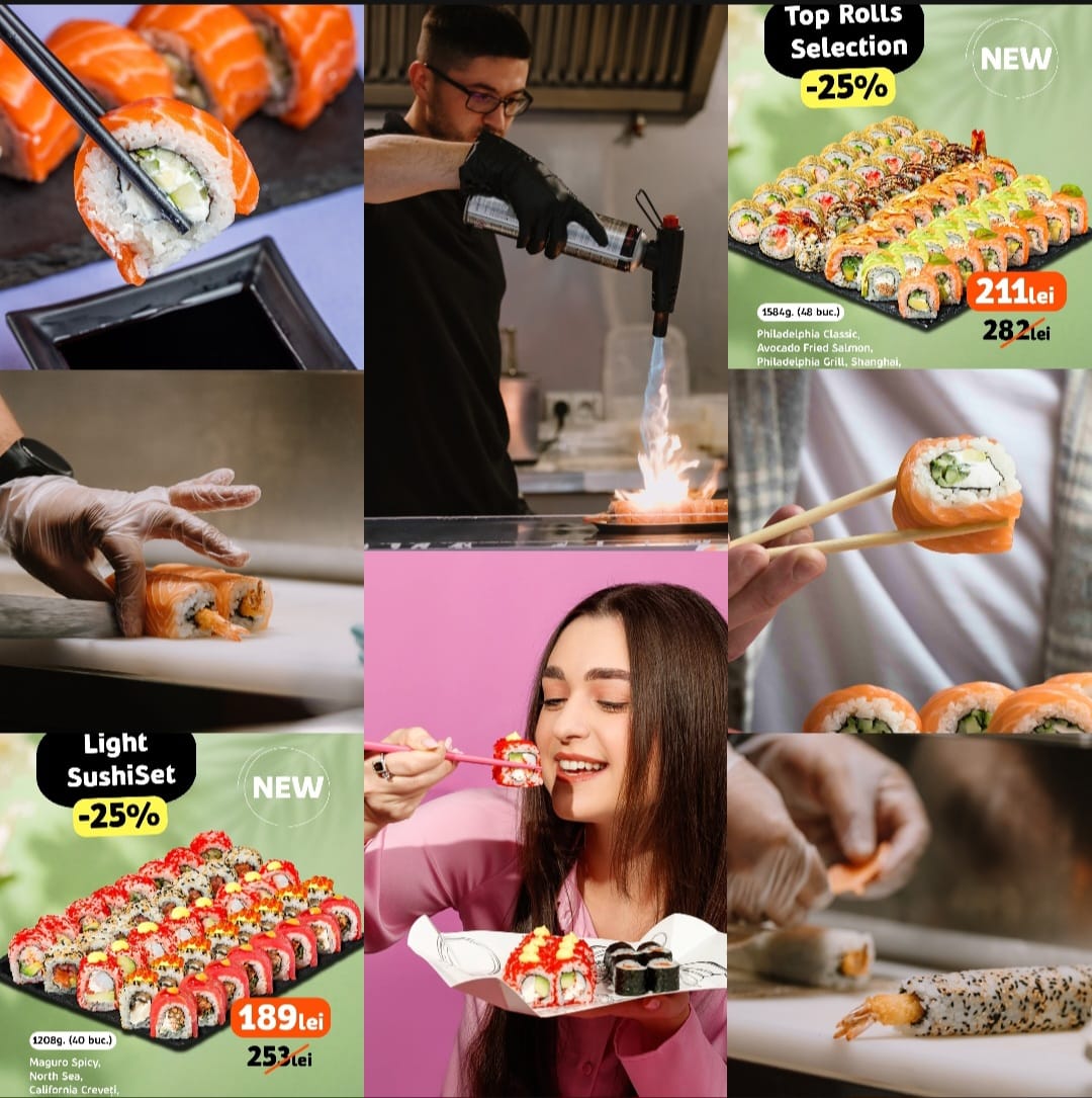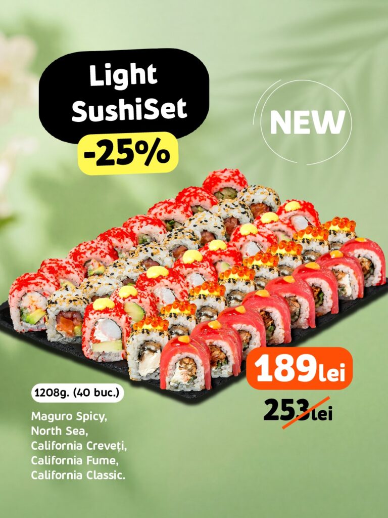 Pentru cei care preferă variante mai fresh, Light Sushi Set este alegerea perfectă. Cu 40 de bucăți (1208g), include roll-uri precum Maguro Spicy, North Sea, California Creveți, California Fumé și California Classic. Acest mix pune accent pe prospețime, arome echilibrate și combinații ușor de savurat, fiind ideal atât pentru începători, cât și pentru cunoscători. Și aici ai parte de o reducere de 25%: de la 253 lei la doar 189 lei.