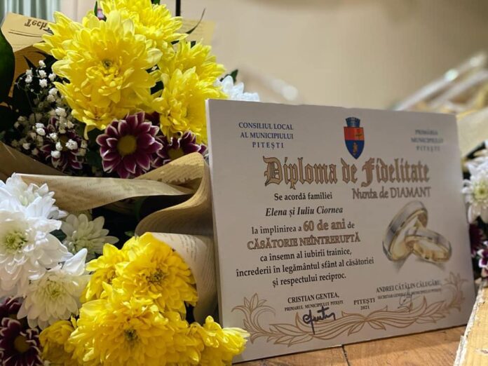 42 de cupluri au fost premiate pentru aniversarea a 50 ani, respectiv 60 de ani de căsnicie neîntreruptă, in Pitesti. Primăria Municipiului Pitești, Cristian Gentea, a premiat marti, 14 decembrie, 42 de cupluri din comunitatea piteșteană care aniversează peste o jumătate de secol de căsătorie. Într-un cadru restrâns, la Filarmonica Pitești, 8 cupluri care sărbătoresc nunta de diamant și 34 de cupluri care celebrează nunta de aur au primit diplome de fidelitate, buchete de flori și premii în bani, din partea municipalității piteștene. Fiecare cuplu longeviv a primit în dar suma de 600 de lei.