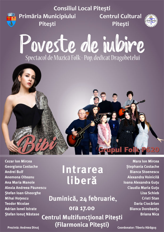 Primăria Municipiului Pitești și Consiliul Local organizează prin Centrul Cultural Pitești, spectacolul de muzică folk-pop, sub genericul „Poveste de Iubire”, duminică, 24 februarie, de la ora 17,00, la Centrul Multifuncțional Pitești(sediul Filarmonicii Pitești). La evenimentul aflat la a II-a ediție și dedicat Dragobetelui, sărbătoarea iubirii la români, intrarea este liberă, în limita locurilor disponibile.