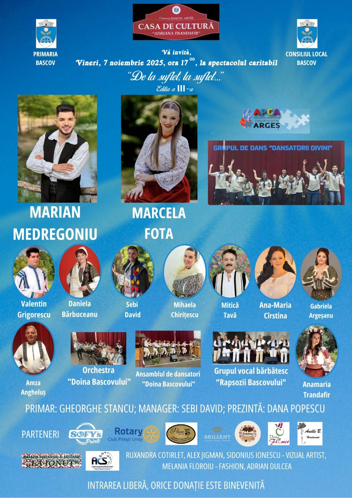 Asociația Părinților Copiilor cu Autism Argeș (APCA Argeș) anunta organizarea celei de-a treia ediții a spectacolului caritabil „De la suflet, la suflet”, eveniment ce va avea loc vineri, 7 noiembrie 2025, ora 17:00, în sala de spectacole a Casei de Cultură „Adriana Trandafir” Bascov.