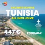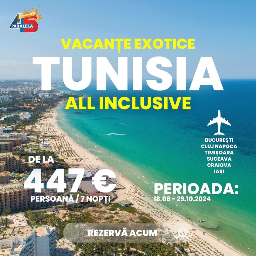 - Charterul de Tunisia– Soare, plaje, mâncare delicioasă, cultură vibrantă și obiective fascinante – Tunisia e destinația perfectă pentru o reîncărcare totală. The Mirage Resort and Spa 5*: 659 eur/pers/ all inclusive, pentru plecarea din 10.05.2024, biletul de avion si transferul inclus; Royal Azur Thalassa 5*: 759 eur/pers/all inclusive pentru plecarea din 10.05.2024, biletul de avion si transferul inclus.